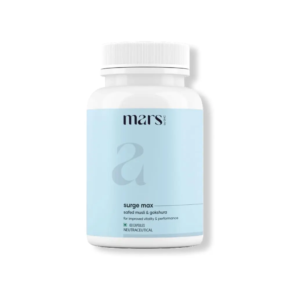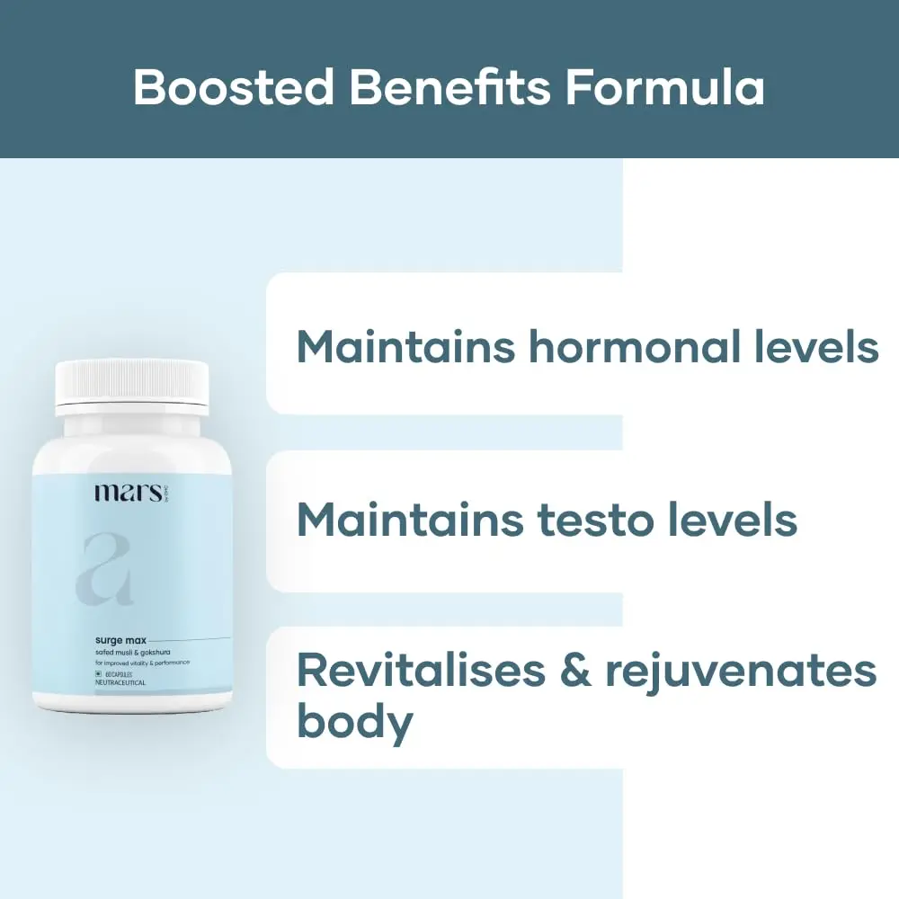 Surge Max: Unlock your peak performance with the power of Ayurveda. Surge Max capsules are a 100% vegetarian and Ayurvedic formulation designed to naturally enhance your muscle strength, boost your energy levels, and fortify your overall immunity. These capsules are carefully crafted with potent Ayurvedic herbs known for their revitalizing and restorative properties. Regular use of Surge Max helps in muscle recovery after workouts, reduces fatigue, and improves stamina, allowing you to push your limits further. Beyond physical benefits, Surge Max supports your overall well-being by helping to maintain essential hormone levels, vital for energy production and a healthy immune response. Experience the holistic benefits of Ayurveda and revitalize your life with Surge Max.