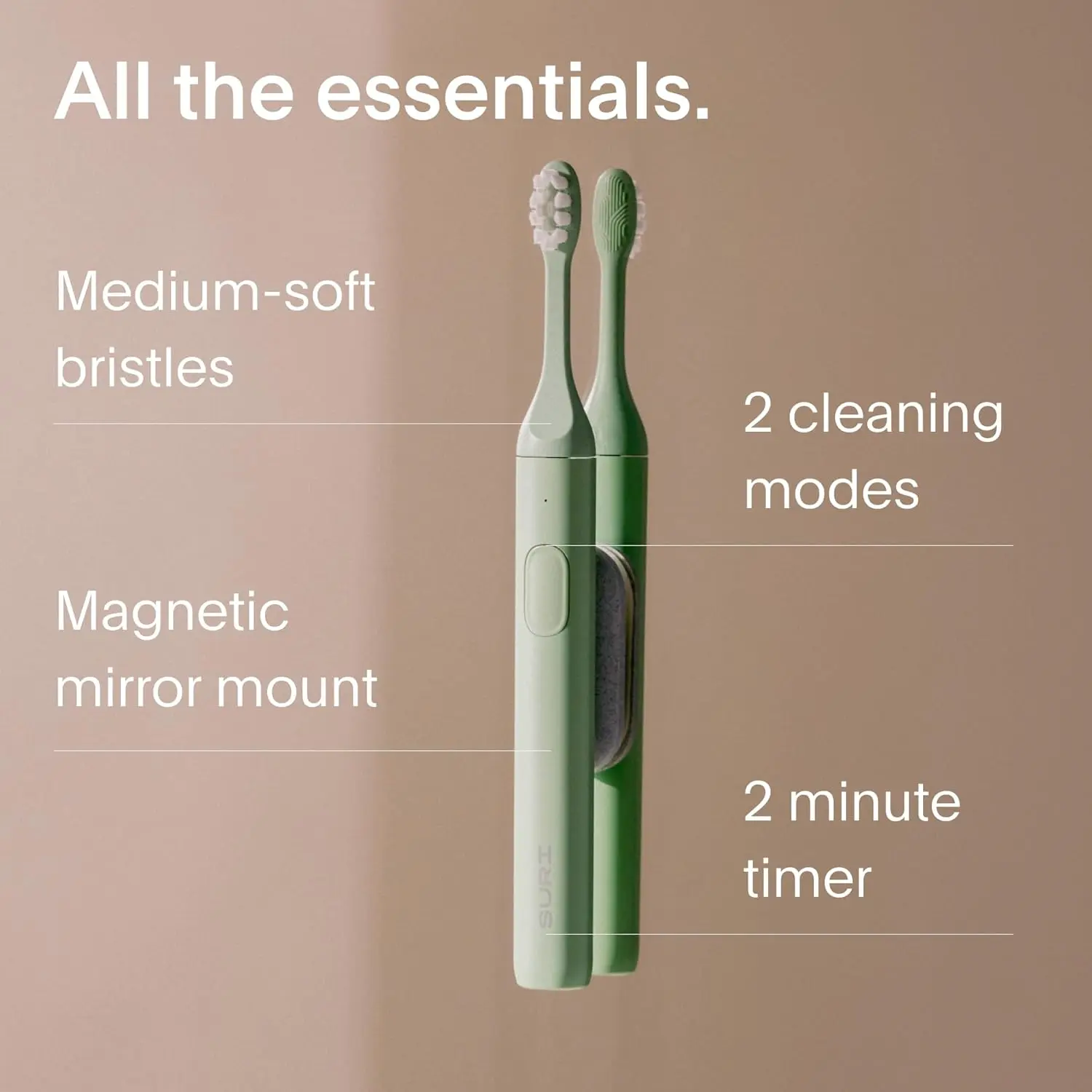 Experience the future of oral hygiene with the SURI Sustainable Electric Toothbrush. This innovative toothbrush combines powerful cleaning with a commitment to sustainability. Its MicraSonic motor, though one-third the size of standard electric toothbrush motors, delivers an impressive 33,000 plaque-lifting vibrations per minute. The sleek, durable matte aluminum body is not only stylish but also designed for repair. The plant-based head and bristles, made from cornstarch and castor oil, are recyclable, and SURI offers free recycling. Included is a self-cleaning travel case featuring UV-C LED technology that eliminates 99.9% of bacteria on your brush head in just one minute, while also charging your brush via USB C. Enjoy a long-lasting 40+ day battery life with a single three-hour charge. SURI removes 300% more plaque than manual toothbrushes, promoting healthier gums. Choose between two cleaning modes: Everyday Clean and Polish. Each brush head features a built-in tongue scraper and haptic notifications to guide you to a thorough clean. A magnetic mirror mount provides convenient storage, and the IPX7 waterproof rating makes it perfect for shower use. SURI’s packaging is FSC certified and fully recyclable or reusable, reinforcing its commitment to the environment.