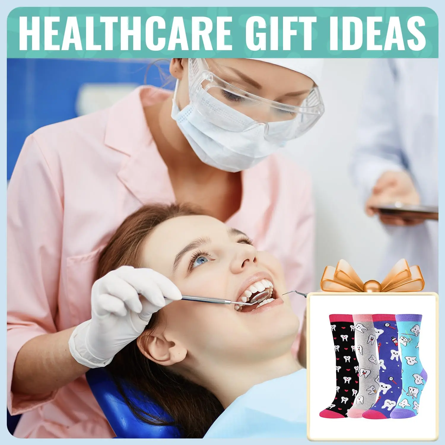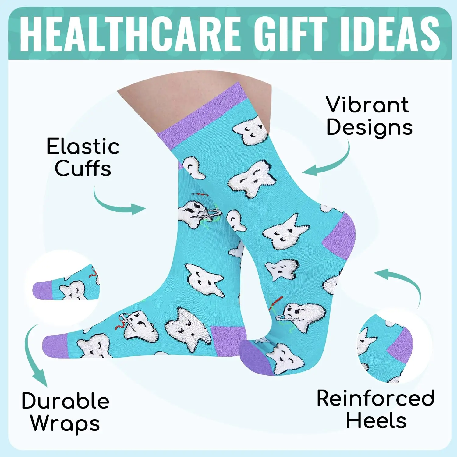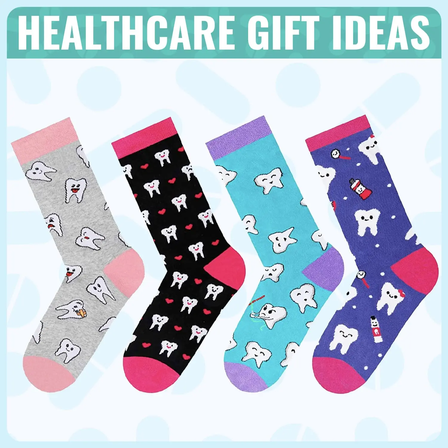 Take a bite out of your day with these adorable and comfy Teeth Socks! These novelty dental socks are the perfect way to show off your dental pride. Featuring embroidered, smiling, pearly white teeth on high-quality crew socks, they’re sure to bring a smile to any smile lover’s face. These fun and unique dentist socks are the ideal gift for dental assistants, dental hygienists, dental students, or anyone in the dental field. Looking for funny dental gifts? Look no further! These tooth socks are a fantastic choice for dental school graduations, dental office celebrations, or just to brighten someone’s day. They even make great gifts for dental patients! Made with a blend of 80% Combed Cotton, 17% Polyamide, and 3% Spandex, these socks are soft, comfortable, stretchy, and breathable. They’re also durable and machine washable, so you can enjoy them for years to come. This pack includes 4 pairs of dental socks for women, beautifully packaged in an exclusive gift box. They’re designed to fit women’s shoe sizes 6-12 and sock sizes 8-13. Express your passion for dentistry with these charming and practical teeth socks. They’re a fun and fashionable way to show your appreciation for the dental profession and make a statement wherever you go. Whether you’re a dental professional, a student, or simply a fan of healthy smiles, these teeth socks are a must-have addition to your wardrobe. Get yours today and spread some dental joy!