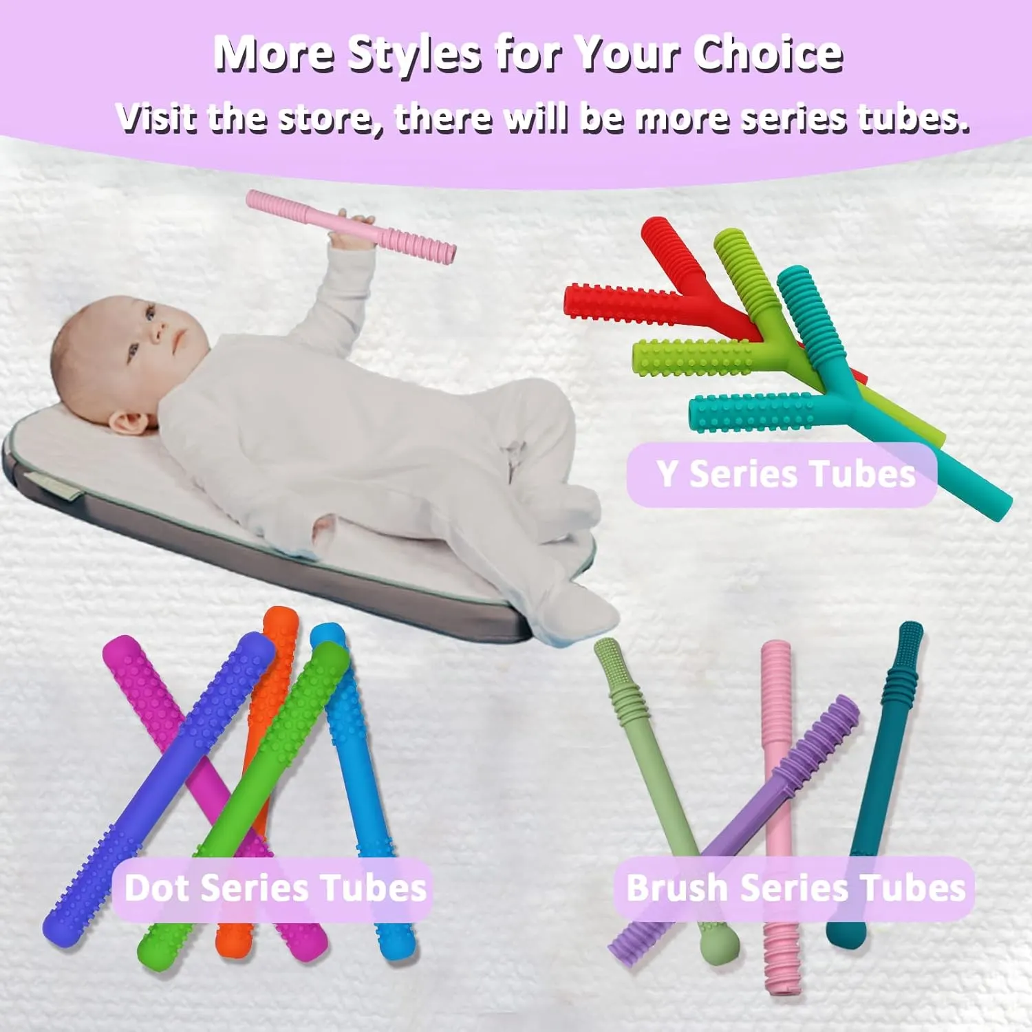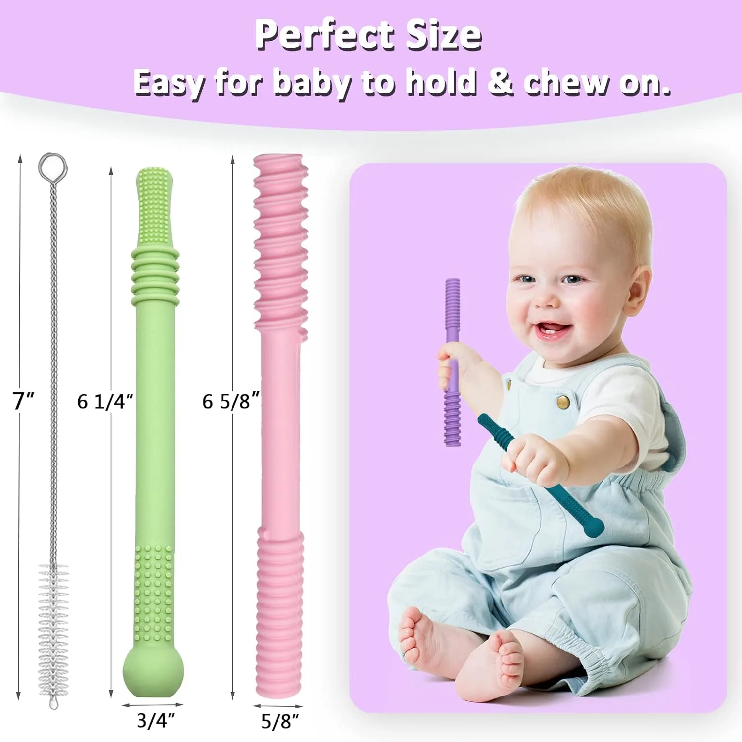 These Teether Tubes for Babies are the perfect solution for soothing your little one’s sore gums during teething! Made from 100% food-grade silicone, these chew toys are safe, durable, and designed with your baby’s health and comfort in mind. Free from BPA, PVC, lead, and phthalates, you can rest assured that your baby is gnawing on a safe and non-toxic product. The unique hollow design and dual-textured surfaces provide a variety of sensory experiences, helping to massage gums and relieve pain. Lightweight and easy for small hands to hold, these teether tubes are suitable for babies aged 6-18 months, and even offer sensory relief for older children and adults with special needs. Cleaning is a breeze – simply wash by hand with soap and water or toss them in the top rack of your dishwasher. These teether tubes are also refrigerator and freezer safe, providing extra cooling relief for inflamed gums. More than just a teething toy, these tubes discourage thumb sucking and other habits by giving your baby a safe and satisfying alternative to chew on. They’re the ideal baby shower gift and a must-have for new moms. Provide comfort and promote healthy development with these versatile and easy-to-clean teether tubes. Their construction supports early oral development and reduces the urge to put fingers and other objects in the mouth. The flexible and durable silicone ensures long-lasting use, even with the most enthusiastic chewers. Give your baby the safe and effective teething relief they deserve! The textures provide a soothing experience.