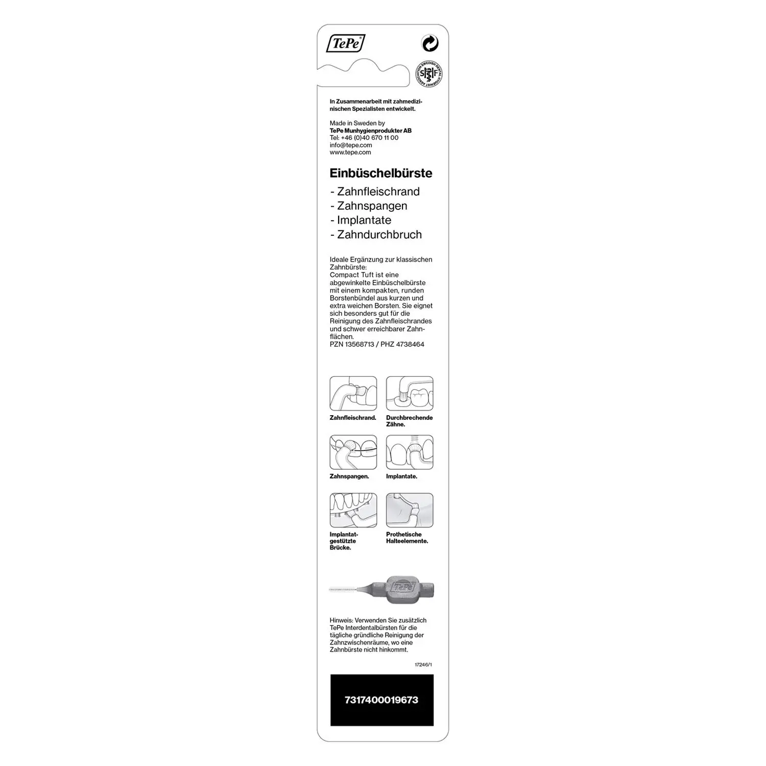 The TePe Compact Tuft Brush is designed for cleaning implants, braces, crowns and bridges. Its compact head and soft bristles allow for effective cleaning in hard-to-reach areas.