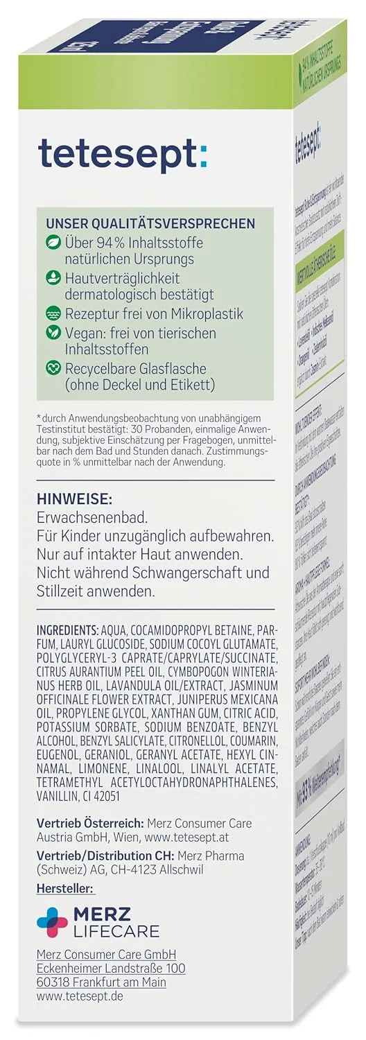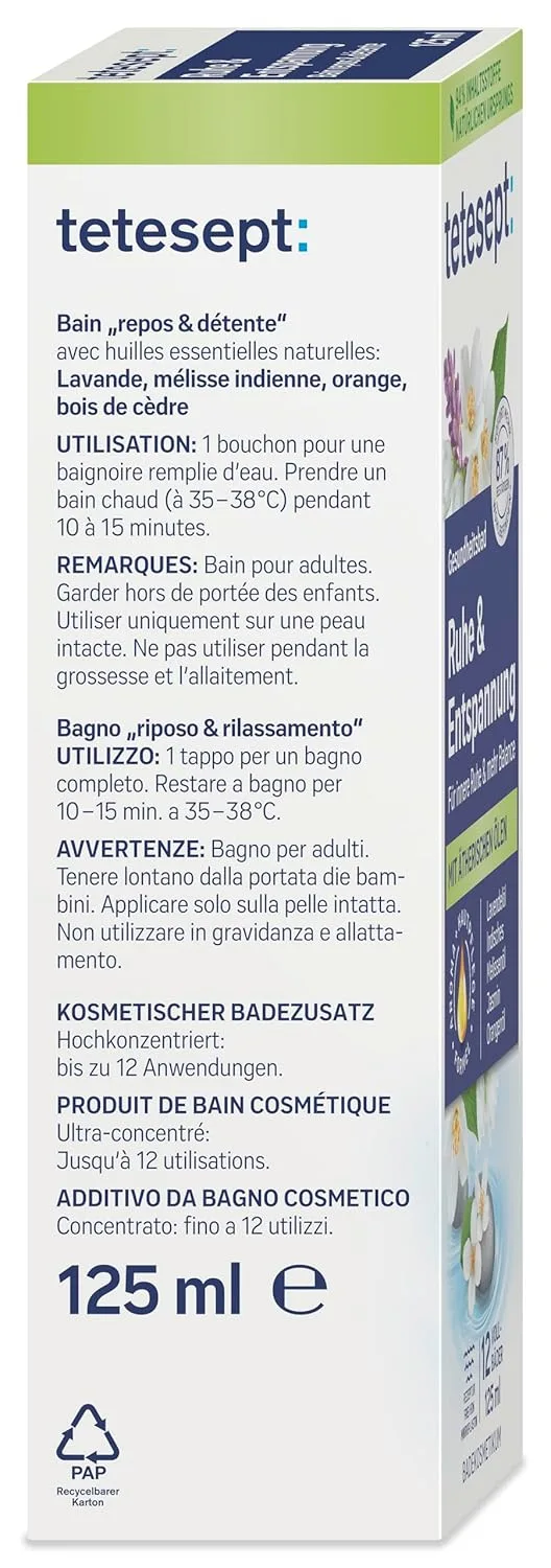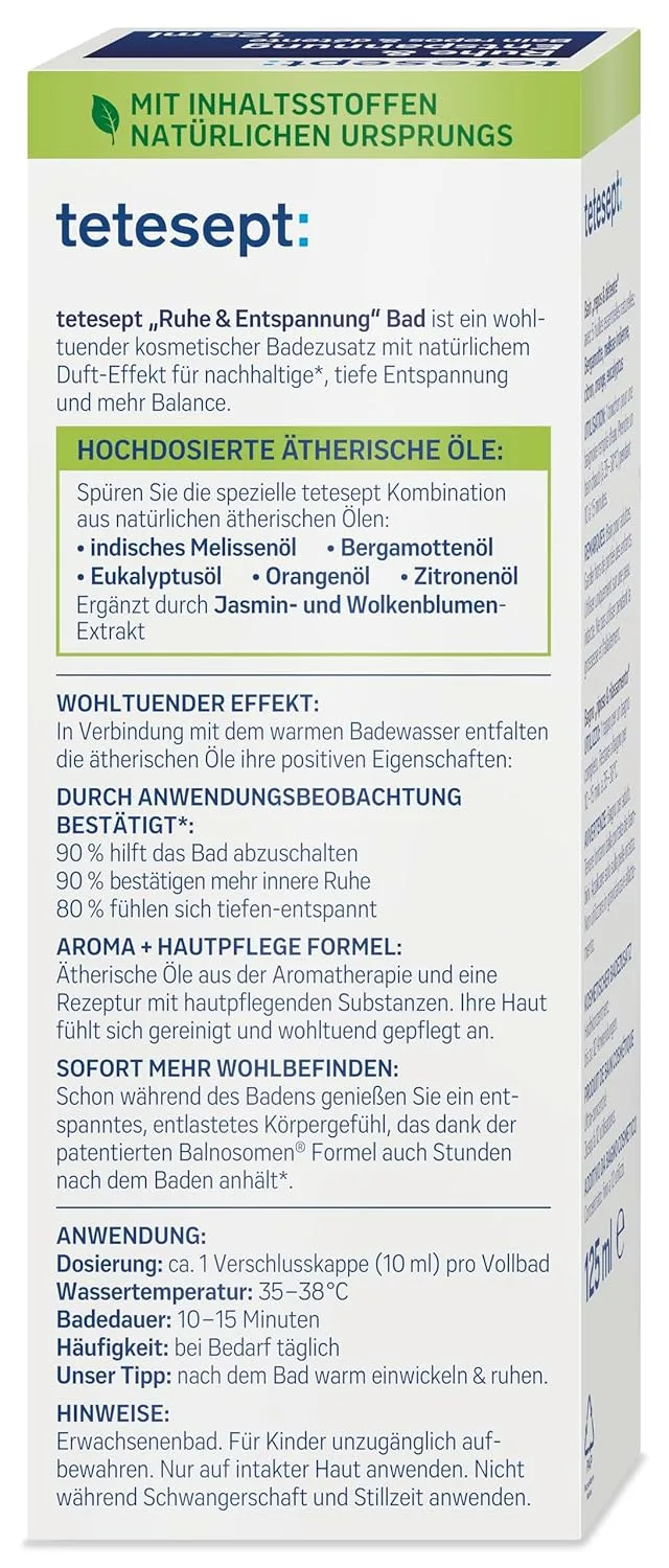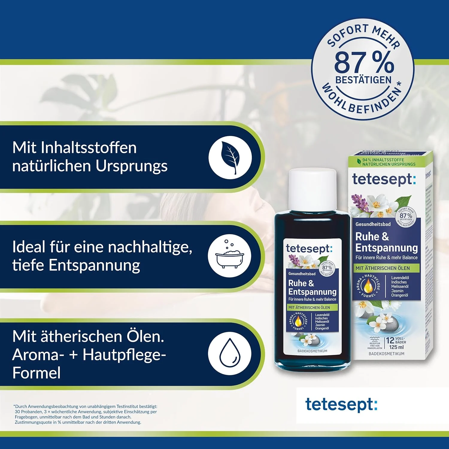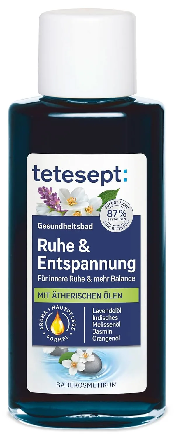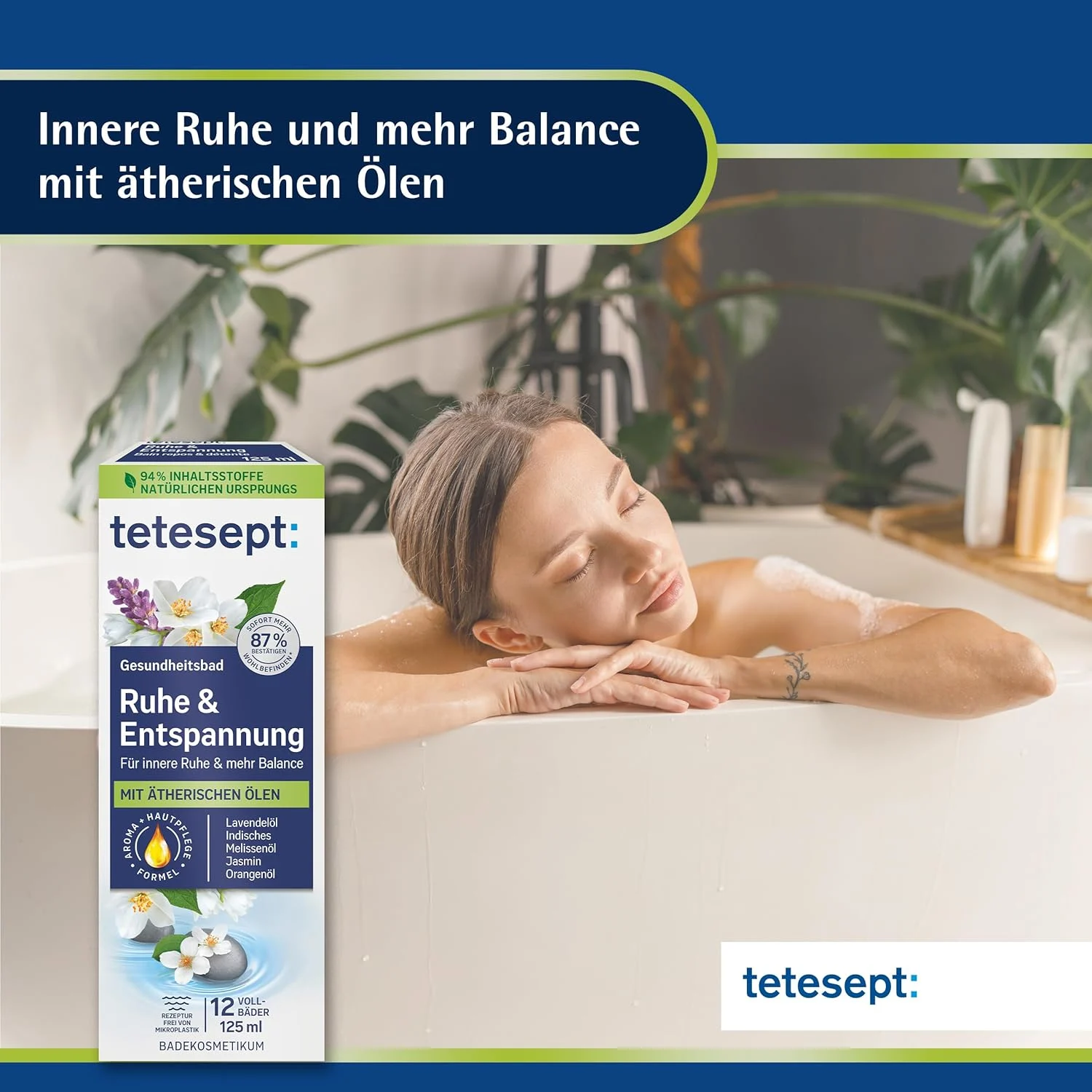 Unwind and find your inner peace with tetesept Rest & Relaxation Bath. This bath additive is expertly crafted with a unique aroma and skin care formula to provide soothing care for your skin while delivering sustainable, deep relaxation that lasts for hours. Indulge in the harmonious blend of essential oils, including the uplifting scents of bergamot and orange, the calming aroma of Indian balm, the zesty freshness of lemon, and the invigorating touch of eucalyptus. These carefully selected oils are further enhanced by the delicate extracts of jasmine and cloud flowers, creating a truly immersive and tranquil bathing experience. Immerse yourself in the soothing waters and let the tension melt away as the aromatic blend works its magic, promoting a sense of inner peace and balance. In an application observation, 90% of participants immediately confirmed experiencing more inner peace of mind after using the tetesept bath additive. Each 125 ml bottle provides approximately 12 applications, making it perfect for incorporating into your regular self-care routine. Ideal for those seeking relief from tension and stress, the tetesept Rest & Relaxation Bath offers a holistic approach to well-being, combining the benefits of aromatherapy and skin care to create a truly rejuvenating experience. Escape the everyday stresses and transform your bath into a sanctuary of serenity with tetesept Rest & Relaxation Bath.