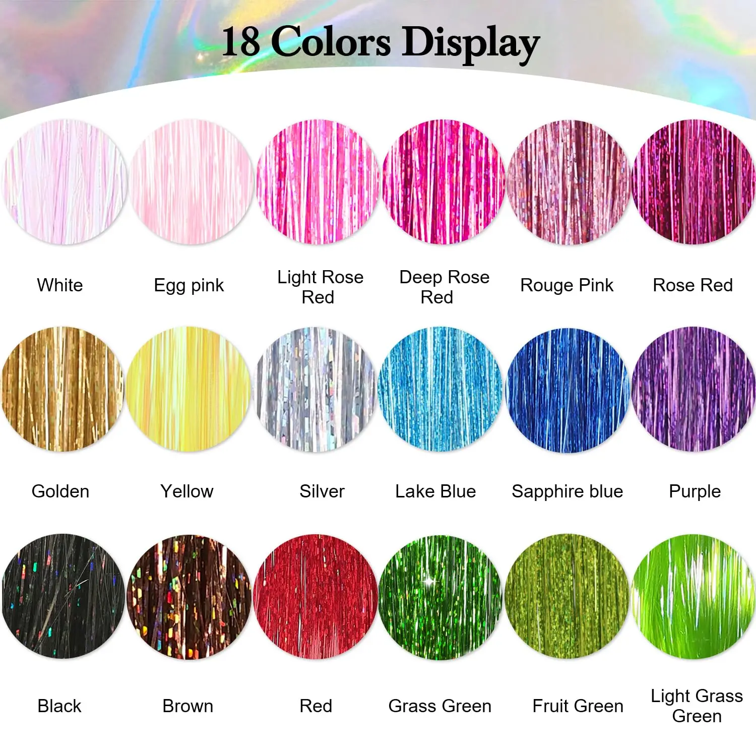 Add dazzling shine and vibrant color to your hair with our Tinsel Hair Extensions! This 8-pack of heat-resistant tinsel hair is the perfect way to elevate your style for any occasion. Each strand is crafted from high-quality 100% polyester fiber, ensuring safety, durability, and long-lasting sparkle. The heat-resistant properties allow you to style with confidence – wash, tumble dry, straighten, style, and even iron the tinsel without worry. Our tinsel hair extensions are designed to be easy to use, whether you’re tying them directly into your hair, using silicone hooks and rings, or attaching them to wig clips. The adjustable 50-inch length provides versatility, allowing you to customize the tinsel to your desired look. Perfect for daily wear, hair salons, and special events like Christmas, New Year’s, Halloween, cosplay, birthday parties, festivals, and weddings, these glitter hair extensions will accentuate your elegance and give you a unique and eye-catching appearance. Each color is individually packaged for easy identification and use. Embrace the latest hair fashion trend and get ready to receive tons of compliments!