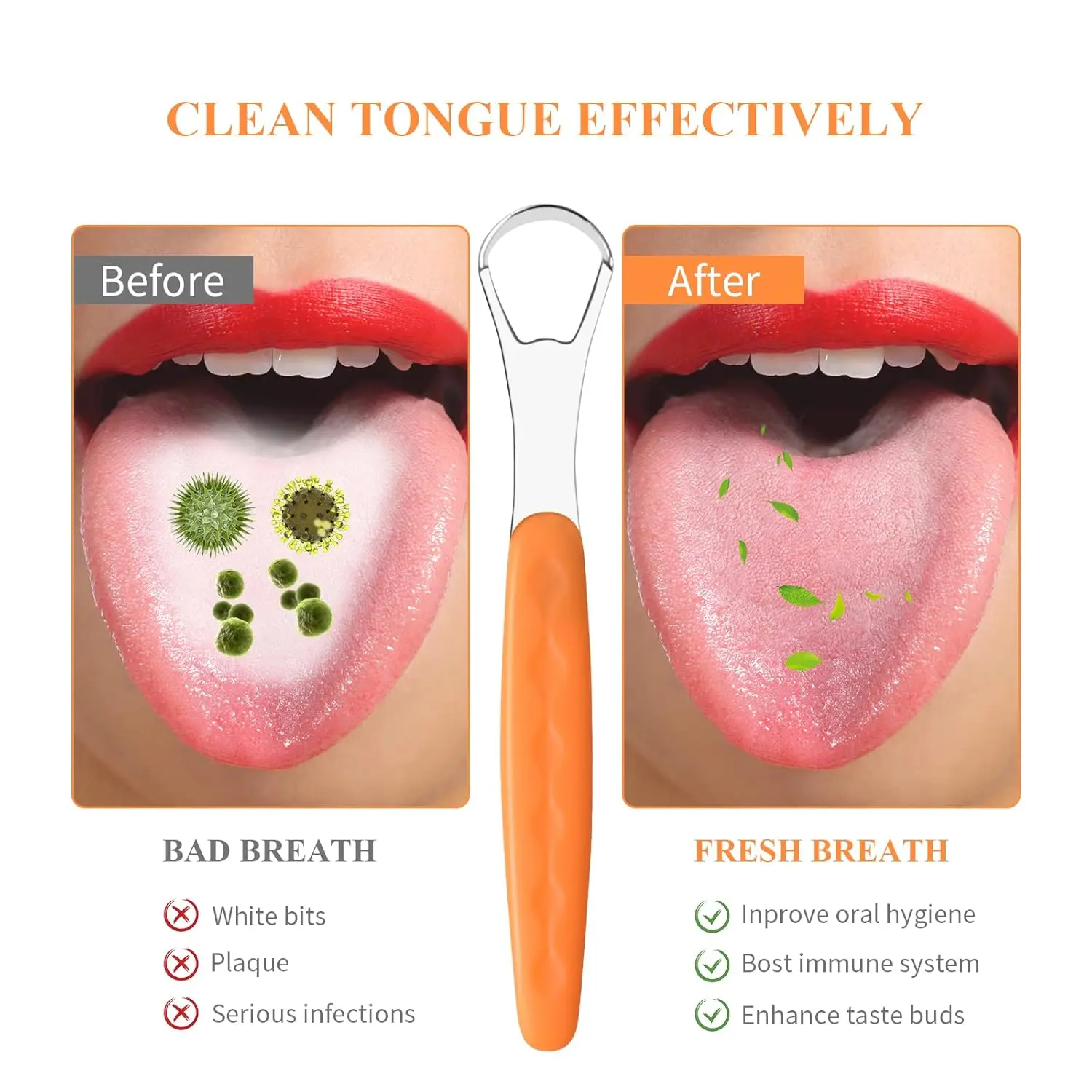 The main task of our tongue scraper is to effectively clean your tongue, removing the unwanted buildup that contributes to bad breath and poor oral health. By incorporating our tongue scraper into your daily routine, you can significantly reduce bad breath, improve your sense of taste, and promote a healthier mouth overall. Make our Tongue Scraper part of your daily routine to enjoy the benefits of a truly clean mouth and fresh breath!