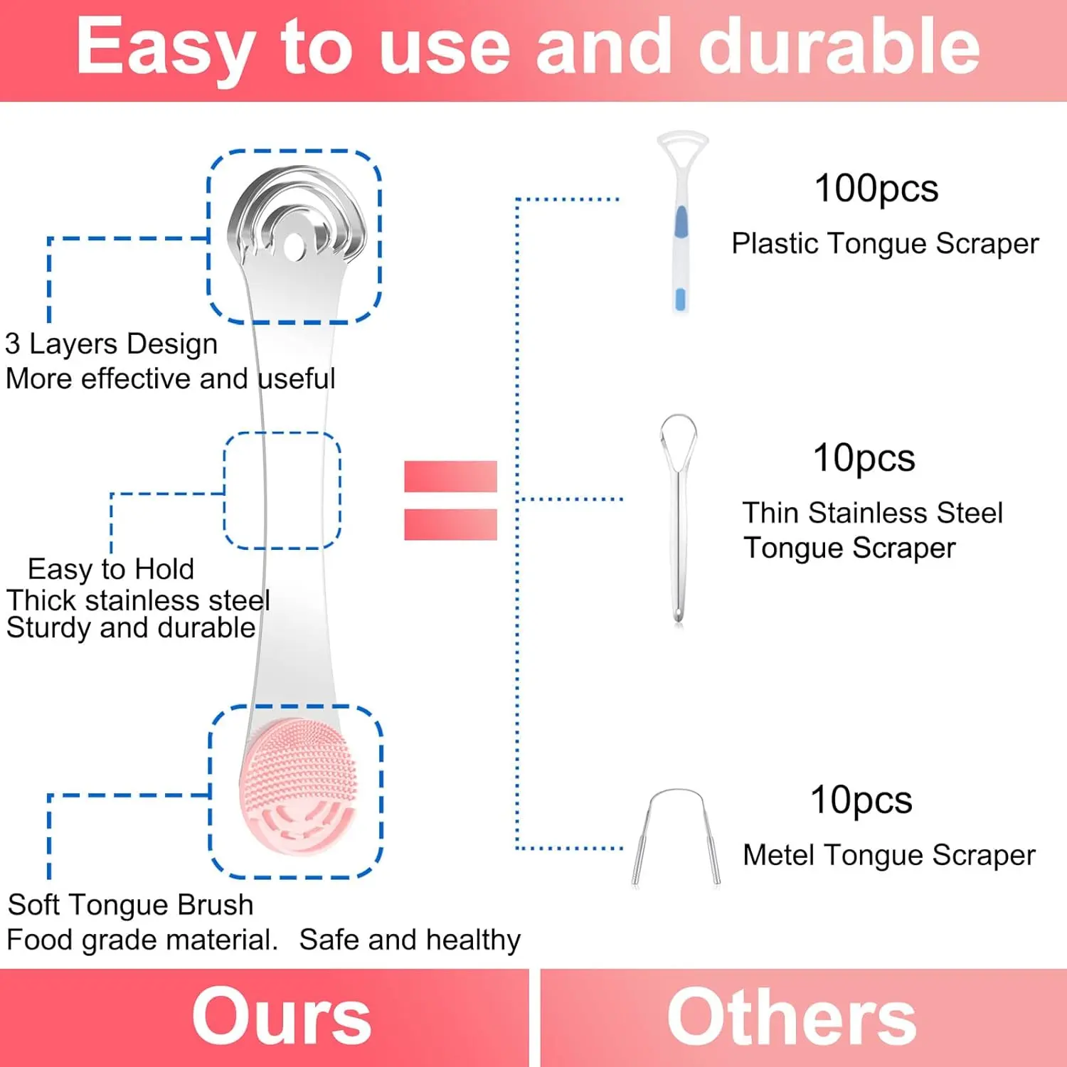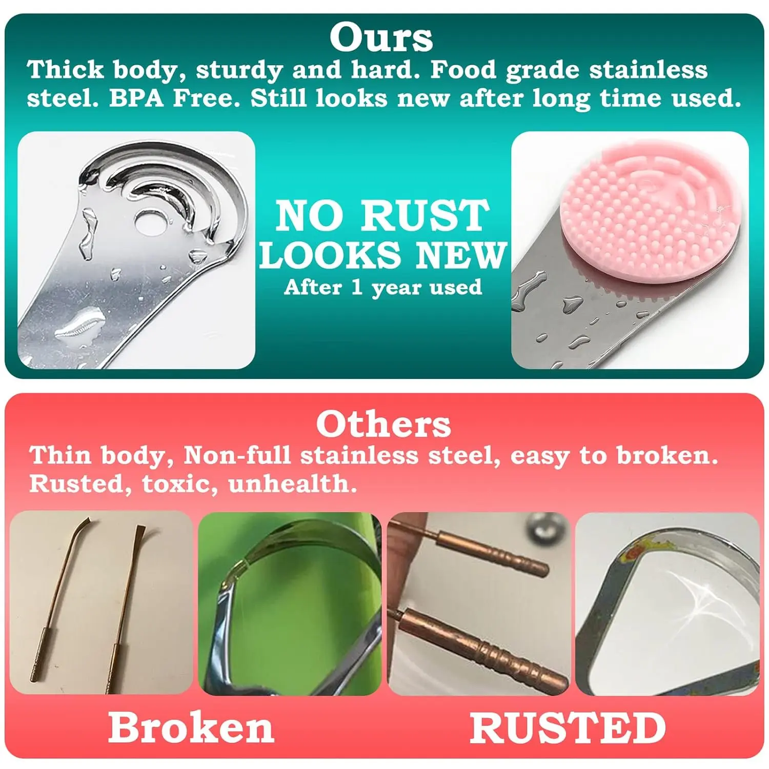 Fight bad breath and achieve a cleaner, healthier mouth with our innovative Tongue Scraper Cleaner! This dual-action tool is designed to eliminate odor-causing bacteria and remove the unsightly white coating from your tongue, revealing a fresher breath and a confident smile. The latest generation in tongue cleaning technology, our scraper combines the benefits of a soft silicone brush and a durable stainless steel scraper for optimal results. Say goodbye to embarrassing bad breath and hello to a revitalized sense of clean. Our ergonomic design ensures comfortable use and easy cleaning, making it a simple yet effective addition to your daily oral hygiene routine. Crafted from medical-grade stainless steel and BPA-free silicone, this tongue scraper is safe, durable, and built to last. The silicone brush gently massages and loosens debris, while the stainless steel scraper effectively removes it, leaving your tongue feeling clean and refreshed. Incorporate this scraper into your morning and evening routine for a noticeable improvement in your oral health and confidence.