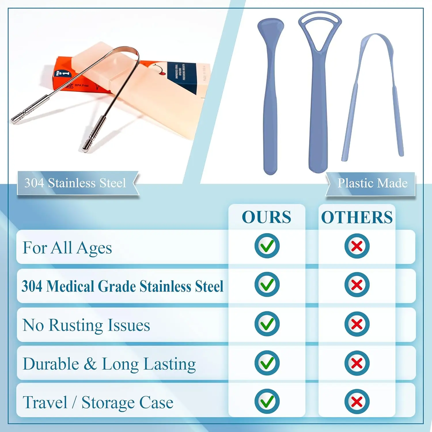 Say goodbye to bad breath and hello to a cleaner, healthier mouth with our Stainless Steel Tongue Scraper! This essential tool is designed to effectively remove gunk, bacteria, and the white coating that can accumulate on your tongue, leading to fresher breath and improved oral hygiene. More than just a breath freshener, our tongue scraper enhances your sense of taste, allowing you to fully enjoy every flavor. Made from 100% medical-grade stainless steel, this durable and non-toxic tool is resistant to rust and mold, ensuring long-lasting performance. It’s incredibly easy to clean – simply toss it in the dishwasher or hand wash. The ergonomic “U” shape is designed for comfortable and thorough cleaning, reaching all areas of your tongue with ease. With non-synthetic handles for a secure grip and an anti-gagging ridge, you can confidently clean the back of your tongue without discomfort. Compact and travel-friendly, this stainless steel tongue scraper is a superior alternative to plastic versions. It can be easily sterilized and won’t break, making it a reliable companion for maintaining oral hygiene at home, at work, or on the go. Loved by customers for its quality and effectiveness, our tongue scraper comes with a satisfaction guarantee. Experience the difference a clean tongue can make!