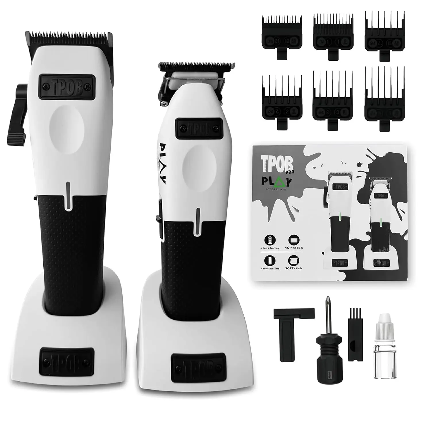 The TPOB Play Clippers offer precision with an XO PLAY Blade and oil reservoirs, stretch 5 lever for fades, dual-speed motor, and quiet operation. Includes 6 guide combs, trimmer, shaver, and charging base.