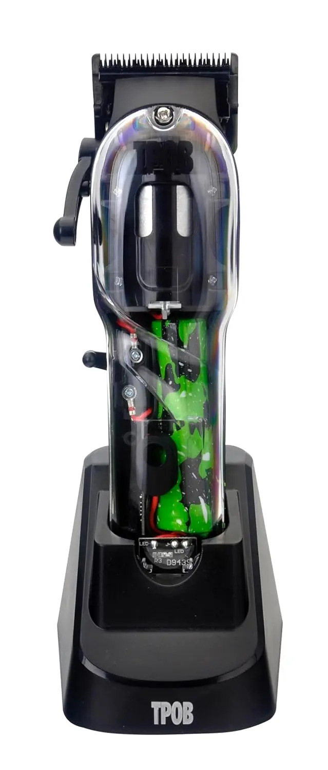 Experience unparalleled precision and performance with the TPOB Slime 2 Professional Hair Clippers in Black Splatts. Engineered for barbers and stylists who demand the best, the Slime 2 delivers seamless blends, effortless texture creation, and efficient bulk hair removal. This cordless clipper allows for complete freedom of movement, enabling you to achieve the perfect cut every time. Our innovative XO Diamond Coated Blade ensures exceptional sharpness and durability, gliding smoothly through all hair types. The integrated Cool Blade Technology keeps the blade cooler during extended use, providing a more comfortable experience for both you and your clients, while also delivering a smoother finish and sharper, cleaner cuts. Forget fumbling with confusing guard sizes! Our Magnetic Guide Combs make selecting and remembering preferred hair lengths a breeze. Each guard is clearly marked, making it simple to match the correct comb to the desired cutting length. The TPOB Slime 2 is more than just a clipper; it’s a complete haircutting system. The included charging stand keeps your clipper ready for action, while the comprehensive set of (0.5, 1, 1.5, 2, 3, 4) guards provides versatility for a wide range of styles. A USB charger offers convenient charging options, and the included oil and protection cap ensure the longevity and optimal performance of your clipper. The newly added 5 Indent Metal Clicking Lever gives you even greater control and precision over your cuts, allowing for fine adjustments and consistent results. Upgrade your toolkit with the TPOB Slime 2 and experience the difference a truly professional clipper can make. Get yours today and unleash your creative potential!
