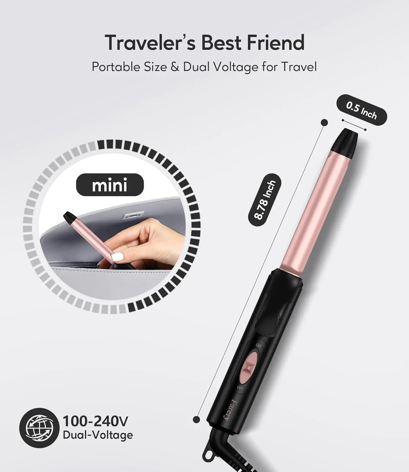 The Farery Mini Curling Iron is your perfect companion for achieving salon-worthy curls, whether you’re at home or traveling the globe! This compact and lightweight iron boasts dual voltage compatibility (100V-240V), making it ideal for international adventures. Just pack a simple power adapter, and you’re ready to style anywhere. Its petite size (only 8.27 inches long and 0.38lbs) ensures it slips effortlessly into any bag without sacrificing valuable space.