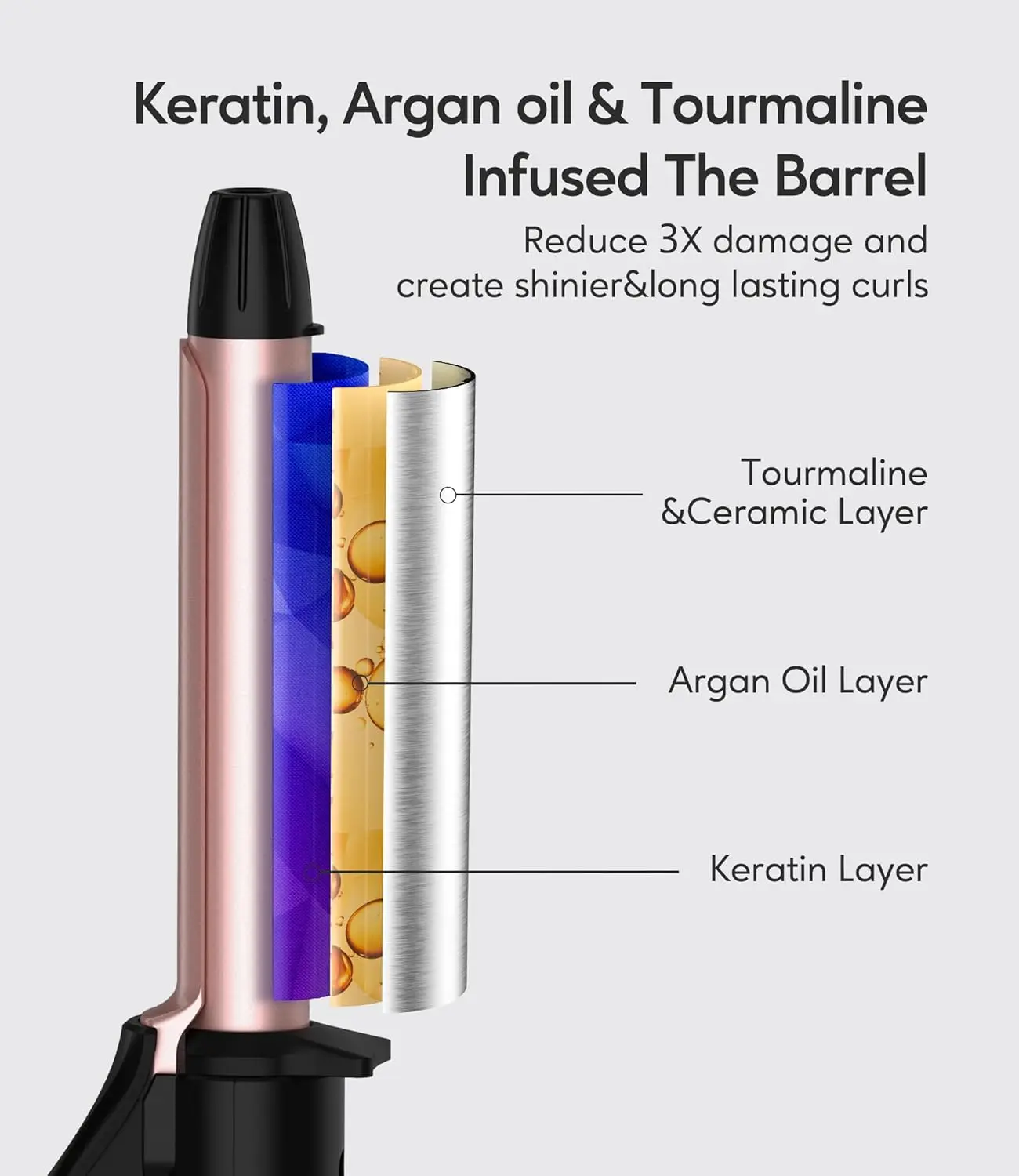 • Keratin, Argan oil & Tourmaline Infused Barrel: For shiny, long-lasting curls