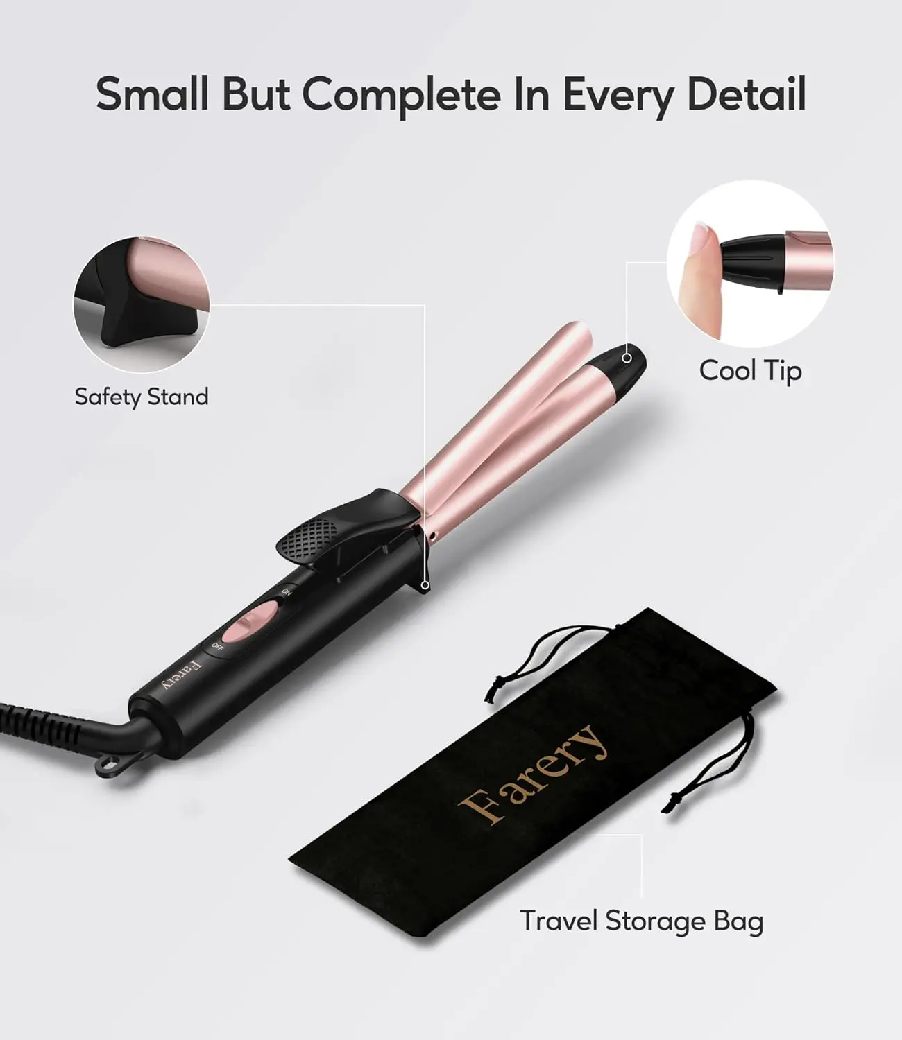 Enjoy tangle-free styling with the 6.5ft extra-long, 360° swivel cord. The included travel storage bag makes it easy to pack and protect your curling iron on the go. Get ready to experience professional-quality curls, wherever life takes you, with the Farery Mini Curling Iron!