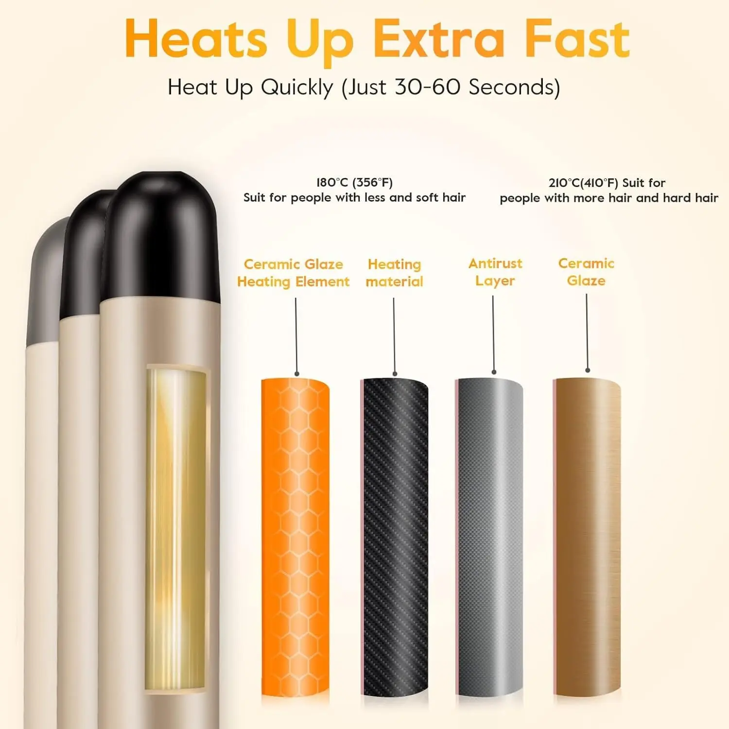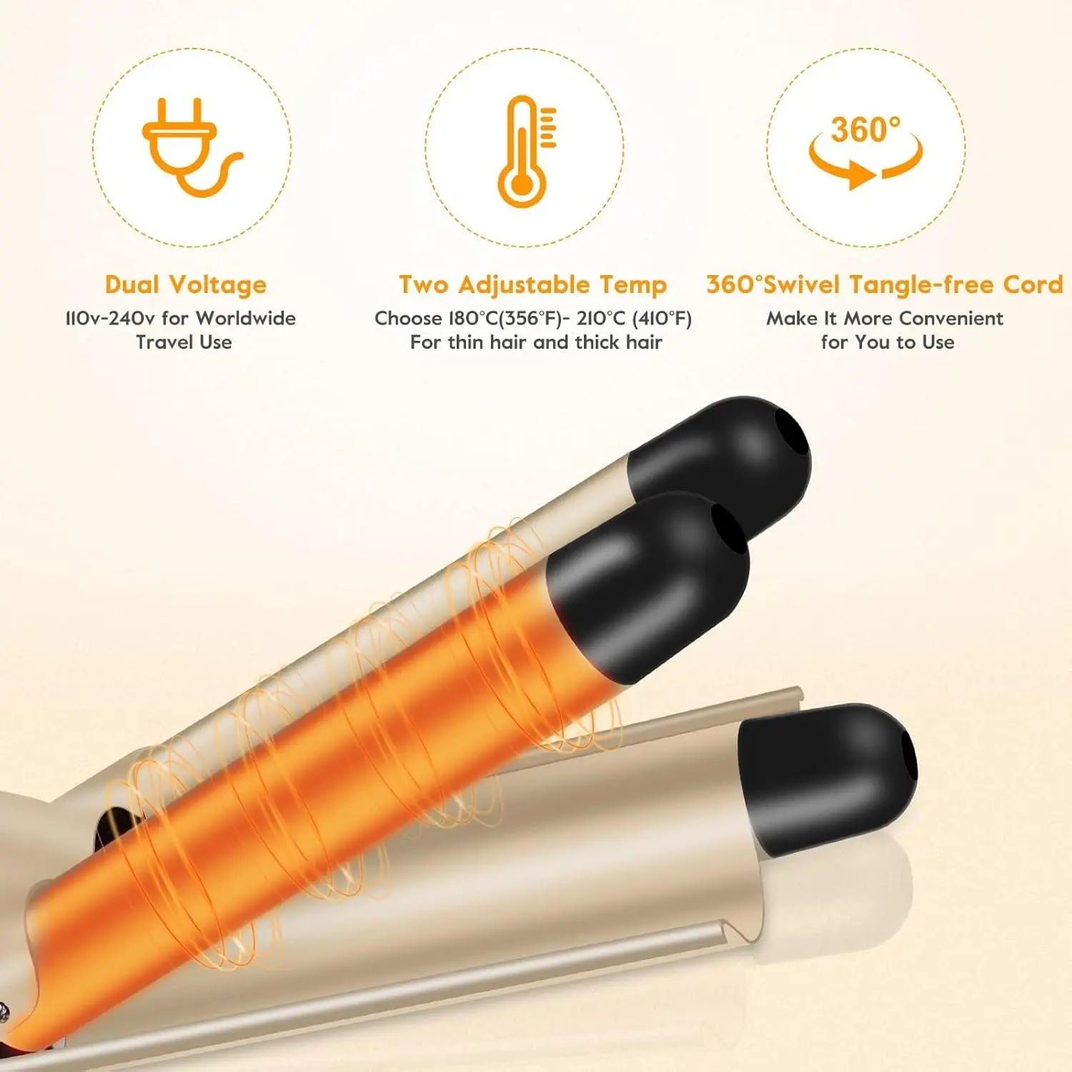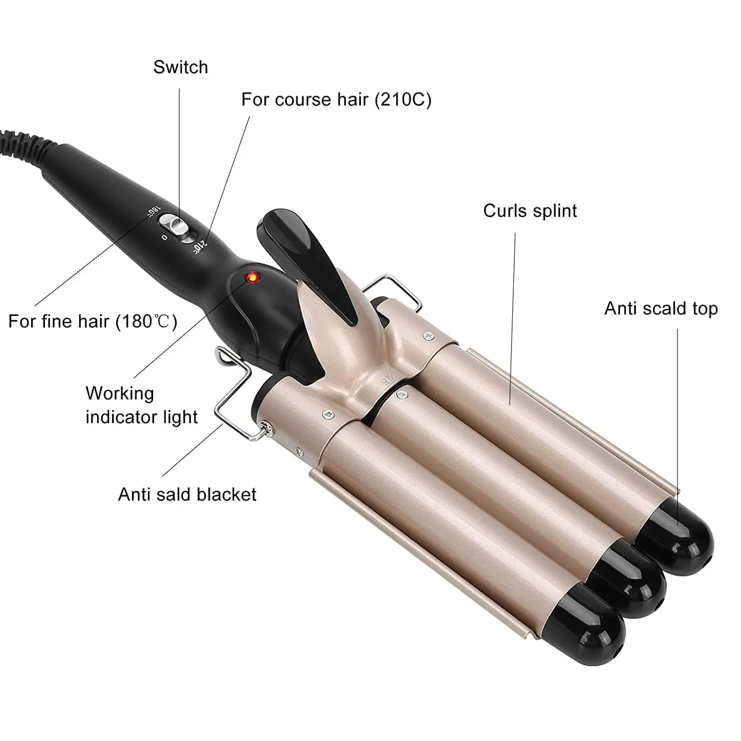 Achieve effortless, salon-worthy waves and curls with our Triple Barrel Curling Iron Waver! This versatile hair styler is designed for both professional and personal use, allowing you to create stunning looks with ease. Whether you desire loose beachy waves, defined curls, or added volume, this travel-friendly curling wand delivers consistent and impressive results. The ceramic barrels heat up quickly and evenly, minimizing heat damage and ensuring a smooth, anti-static finish. Adjustable temperature settings cater to all hair types, from fine and delicate to thick and coarse. Its ergonomic design features a comfortable handle and cool tips for safe and easy maneuvering. Compact and lightweight, this hair styling tool is your perfect travel companion, ensuring you can maintain your desired look wherever you go. Say goodbye to bad hair days and hello to gorgeous, head-turning styles with our Triple Barrel Curling Iron Waver!