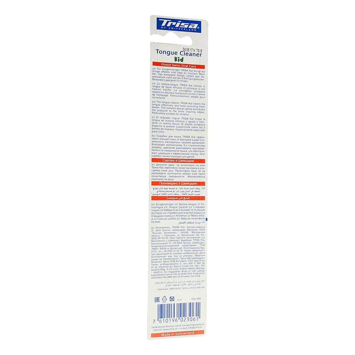 Keep your breath fresh and your mouth healthy with the Trisa Kids Tongue Cleaner. This compact and gentle tongue cleaner is specifically designed for comfortable and effective use, even for children. Its unique shape allows for easy access and thorough cleaning, removing bacteria and metabolic residues that cause bad breath. The Trisa Tongue Cleaner gently distributes pressure across its three cleaning edges, ensuring a comprehensive clean without discomfort. Make tongue cleaning a part of your daily oral hygiene routine for a long-lasting fresh breath experience. This easy-to-use tool is a simple way to improve your overall oral health and confidence. Effectively cleans the tongue, removes food particles, fights bacteria and freshens breath. Regular use will help maintain a healthy mouth and fresher breath every day. Suitable for all ages, but particularly beneficial for children learning proper oral hygiene habits. With Trisa Tongue Cleaner you can enjoy the comfort of cleaning the tongue.