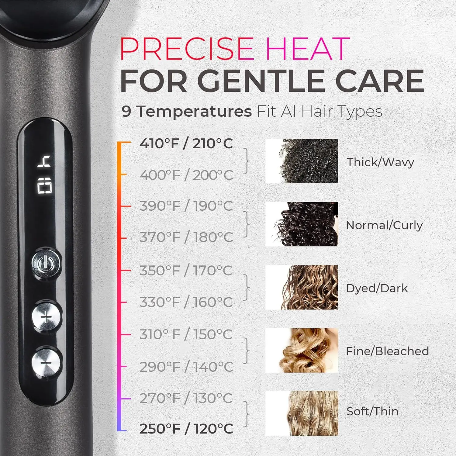 • 9 precise temperature settings (250℉~410℉) for all hair types.