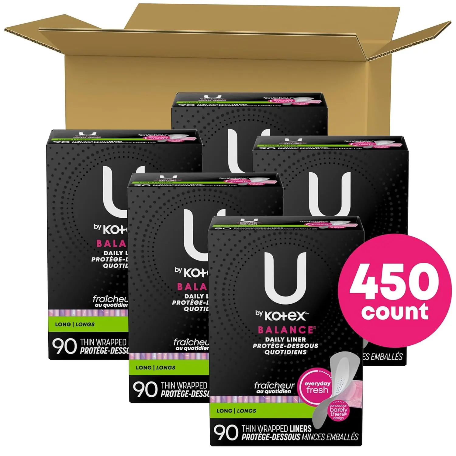 Experience all-day freshness and confidence with U by Kotex Balance Daily Liners. This bulk pack contains 450 thin pantiliners, divided into 5 convenient packs of 90, ensuring you’re always prepared. These liners are designed for light absorbency, perfect for everyday use, backup period protection, or managing light leaks. The quick-absorbing core keeps you feeling fresh and dry, while the breathable soft-touch cover provides superior comfort. You’ll barely notice you’re wearing them, thanks to their uniquely shaped, thin, and super flexible material that moves with your body. Dermatologist-tested and free from harsh ingredients like fragrances, lotions, pesticides, elemental chlorine, and natural rubber latex, U by Kotex Balance Daily Liners are gentle on sensitive skin. Each pantiliner is individually wrapped for discreet and convenient carrying, making them ideal for on-the-go use. Plus, U by Kotex feminine products are FSA, HSA, and HRA-eligible in the US, offering even greater value. Choose U by Kotex for reliable protection and everyday comfort. These liners are made with a breathable soft touch cover, which makes them comfortable to wear all day long. The thin and super flexible material fits and flexes with your body for outstanding skin comfort. You’ll barely know it’s there. These liners are made without fragrances, lotions, pesticides, elemental chlorine, and natural rubber latex. These liners are individually wrapped so you can take each one with you anywhere.