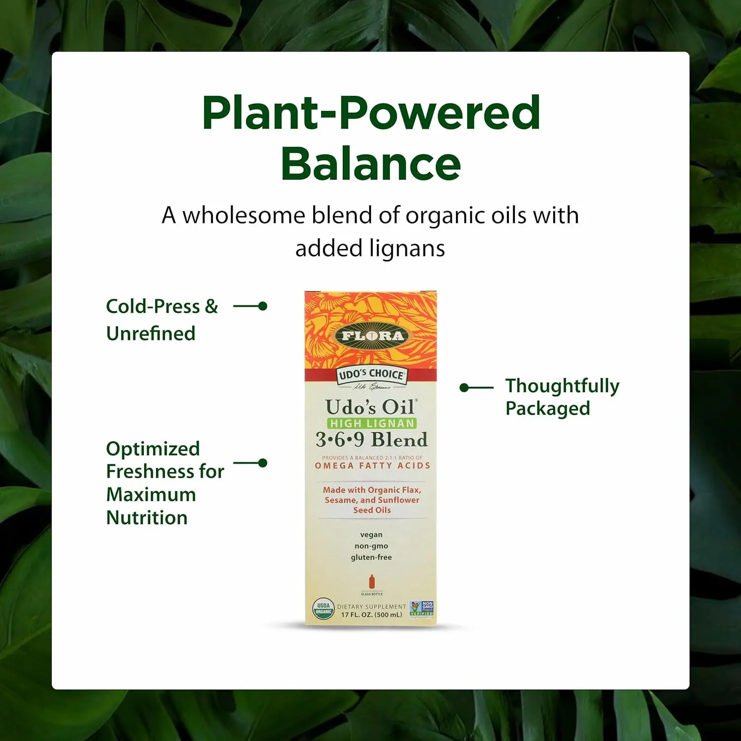 Give your body the essential support it craves with Flora Udo’s Omega 369 Blend. This meticulously crafted blend delivers the essential fatty acids (EFAs) your body needs in a balanced 2-to-1 ratio of Omega-3 to Omega-6. This optimal ratio supports the development and maintenance of a healthy brain, flexible and comfortable joints, optimal eye function, and a robust circulatory system. But the benefits don’t stop there! Flora Udo’s Oil Blend is also rich in high lignan content. Lignans are potent antioxidants that provide further support for your digestive health, fortify your immune system, and contribute to a healthy cardiovascular system. We understand the importance of clean ingredients, that’s why Flora Udo’s Oil Blend is Non-GMO, Certified organic, Kosher, and suitable for Vegans. Incorporating it into your daily routine is effortless. With its light, nutty flavor, this oil blend seamlessly complements all your favorite dishes, from savory culinary creations to sweet treats. You can easily incorporate it into your smoothies, salad dressings, soups, or even drizzle it over your vegetables. Flora Udo’s oil contains all the good fats you need and avoids the bad fats you should avoid. Our formula is derived from natural, unrefined oils extracted from fresh, certified organic flax, sunflower, sesame, and evening primrose seeds, as well as beneficial oils from coconut, rice, and bran. To safeguard the integrity of our precious oils, we package them in light-resistant, dark glass bottles. This ensures that the oil’s peak nutritional value and freshness are preserved from the moment it’s bottled until it reaches your hands. Choose Flora Udo’s Omega 369 Blend to nourish your body from the inside out.