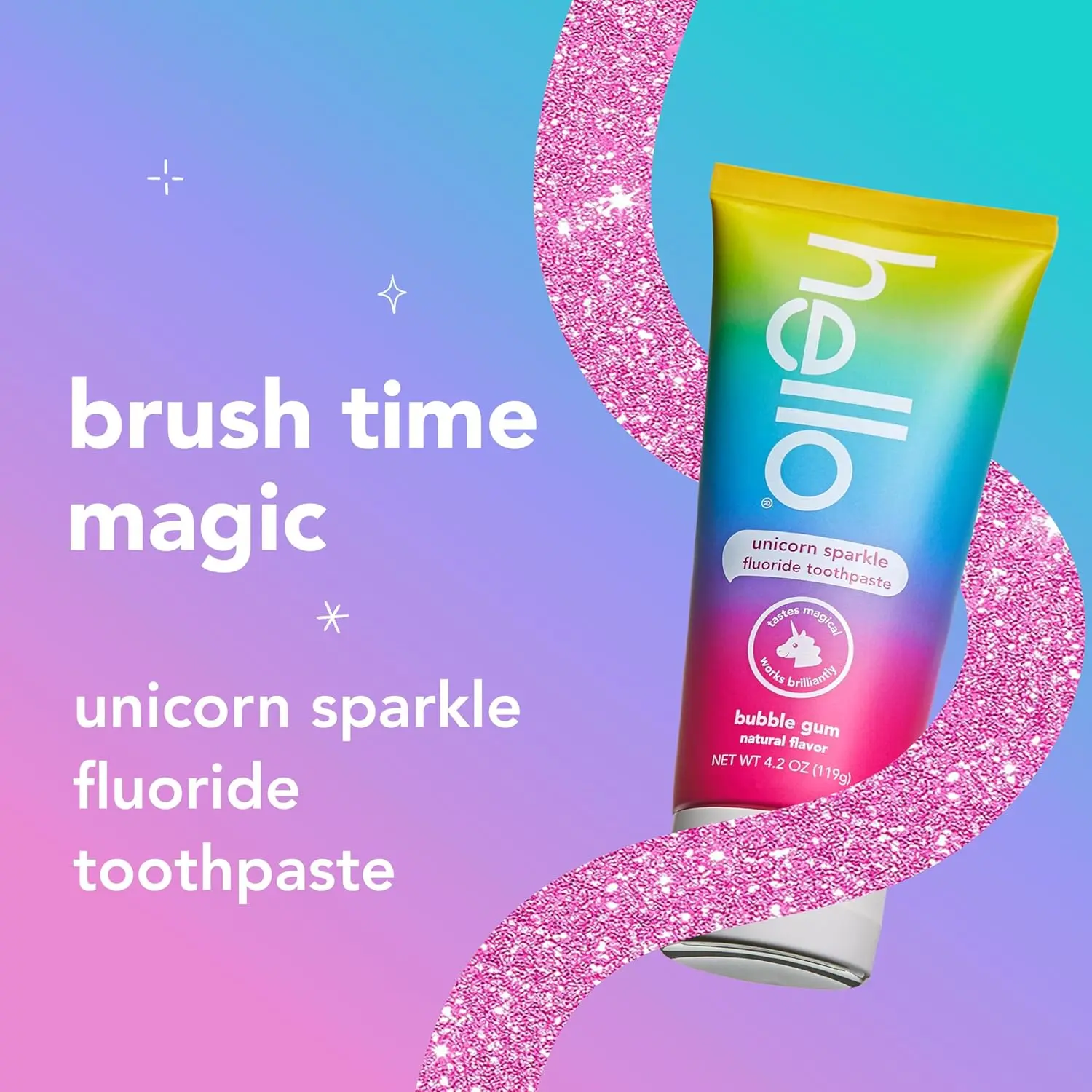(•) Includes three (3) 4.2 oz tubes of hello Unicorn Sparkle Kids Toothpaste
