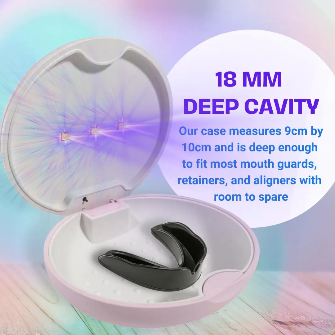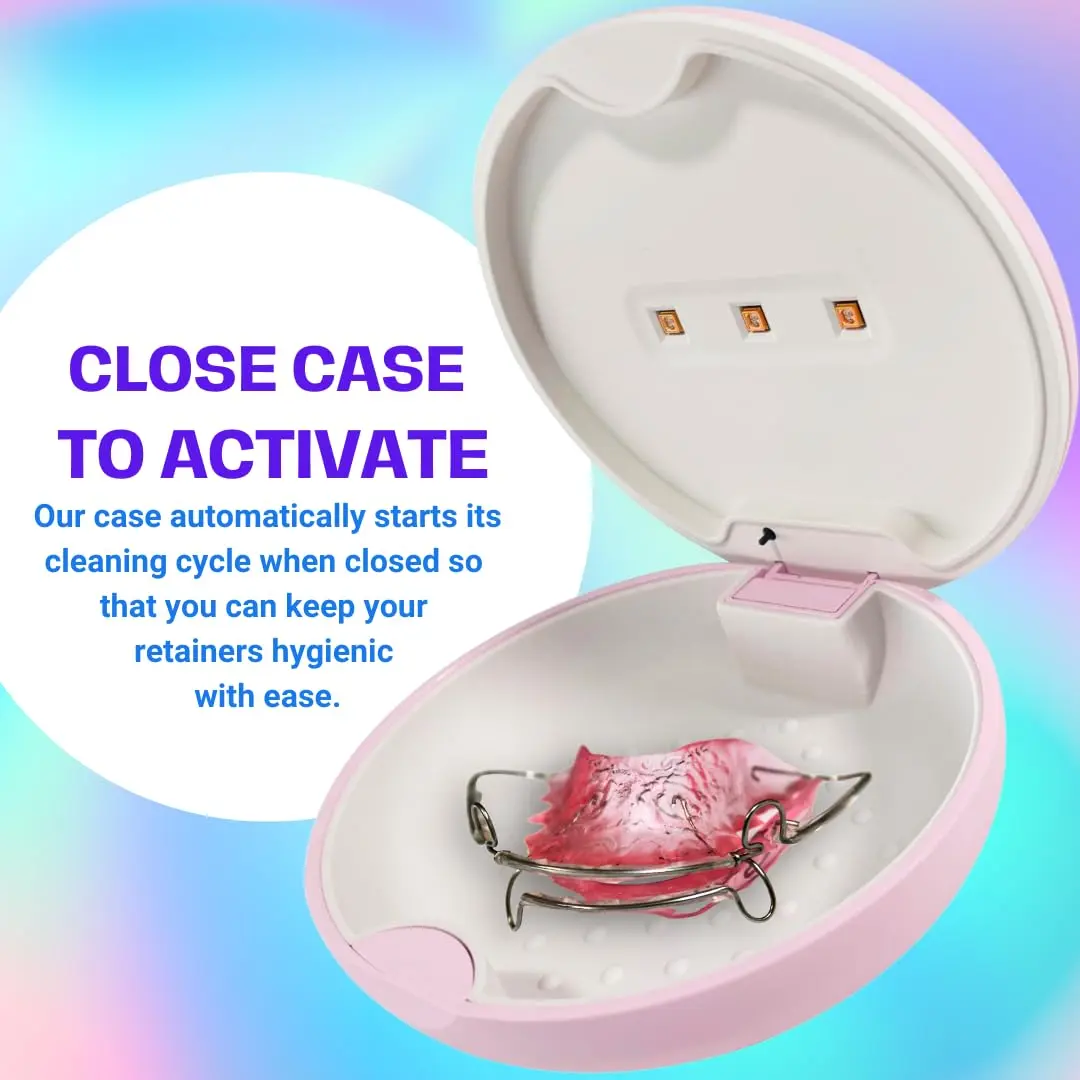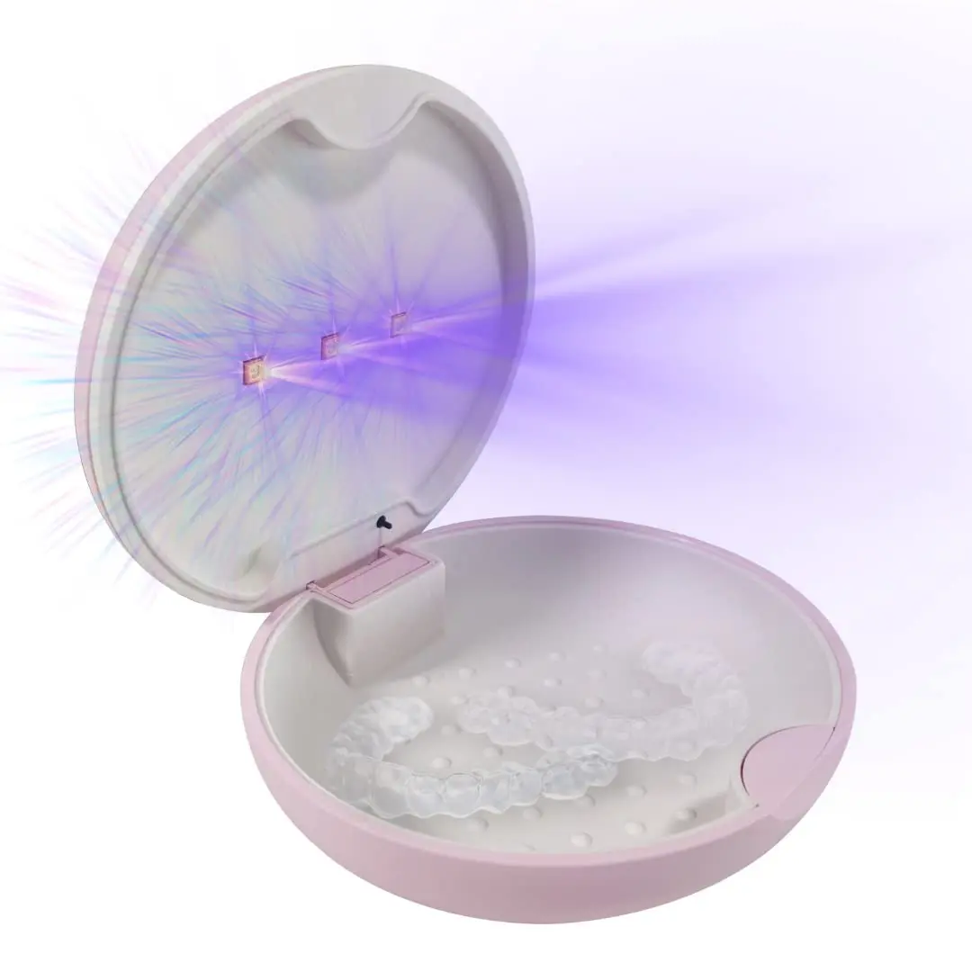 The UVC Retainer Case offers a convenient and effective way to sanitize your Invisalign, mouth guard, or aligners. It features a rechargeable battery and food-grade silicone tray for easy cleaning.