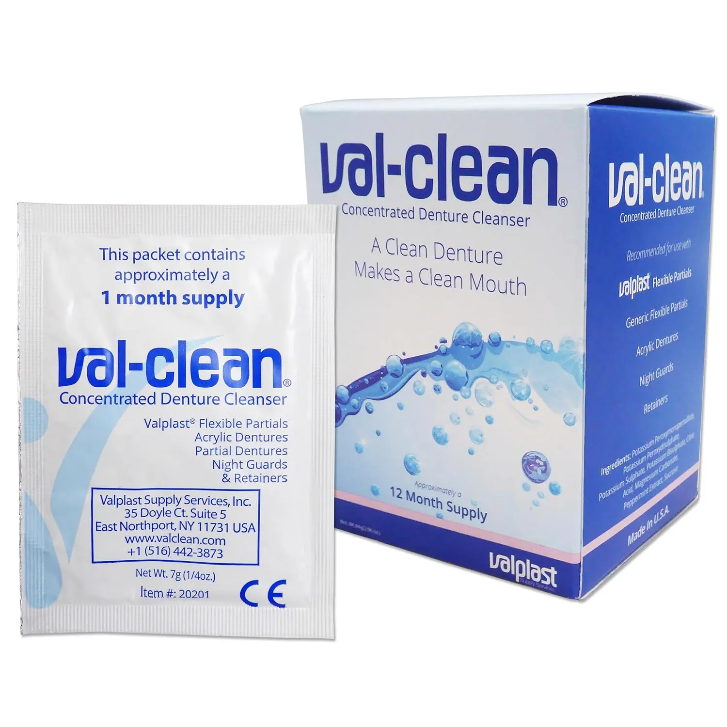 Val-Clean Denture Cleaner ensures effective cleaning of flexible partials, acrylic dentures, and retainers. Includes 12 monthly sachets, silicone brush and brush color options.