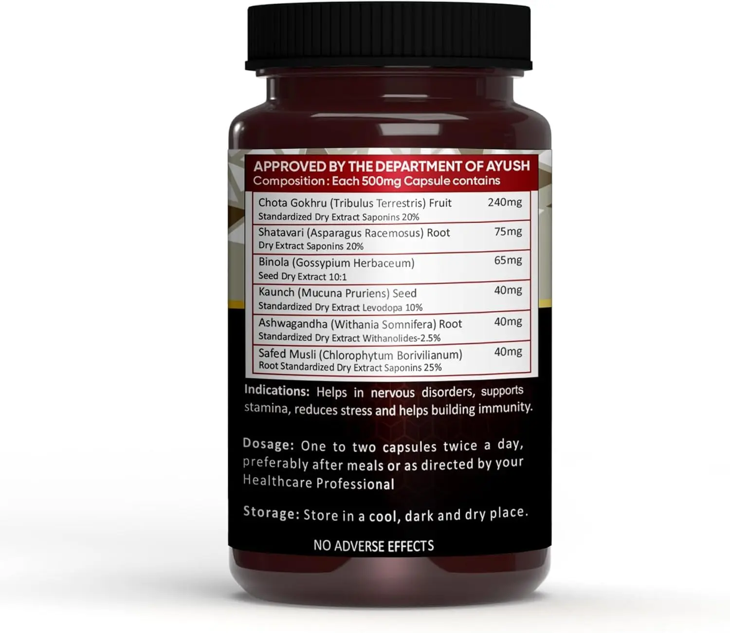 • Contains Shilajeet extract, Safed Musli, Ashwagandha, Kunj beej, Kakra Singhi and Akarkara.
