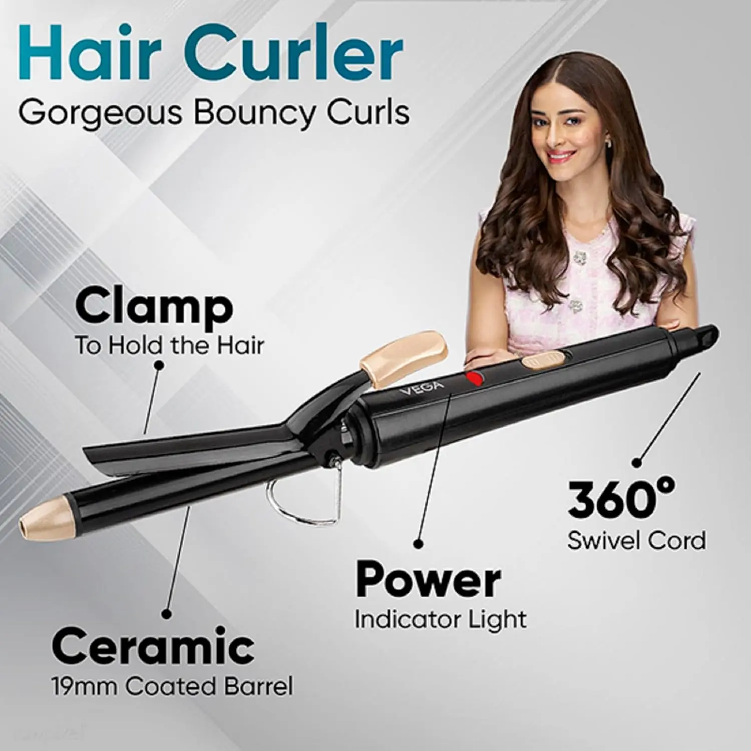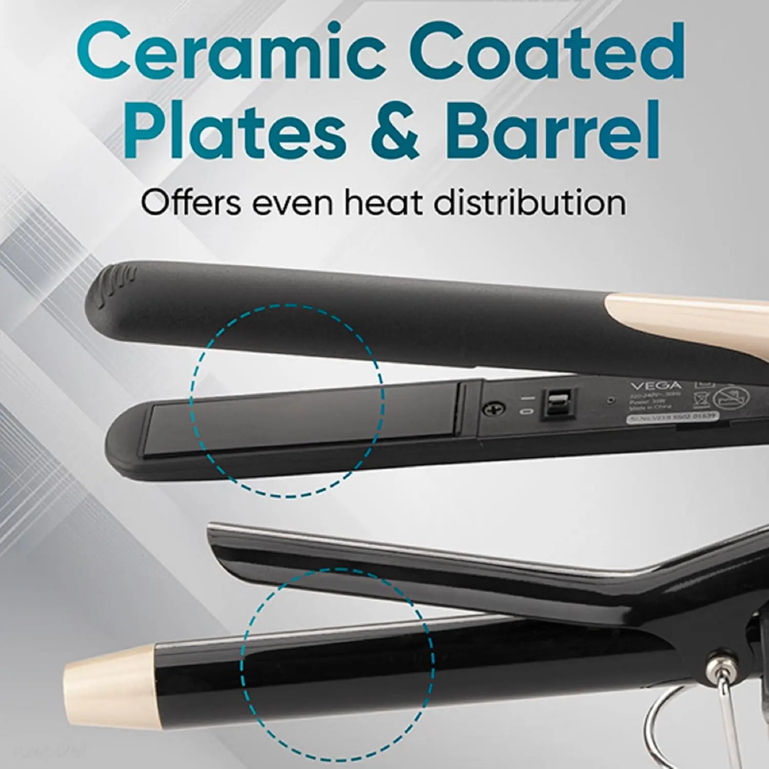 Achieve salon-worthy hairstyles at home with the Vega Miss Versatile Hair Styling Set! This comprehensive set includes everything you need to create a variety of looks, from sleek and straight to bouncy curls and voluminous waves. The set features a high-quality hair straightener with ceramic-coated plates that ensure uniform heat distribution. This prevents hot spots and minimizes damage, resulting in healthy, smooth, and shiny hair every time. Say goodbye to frizz and hello to effortlessly sleek styles. The included hair dryer boasts a powerful 1000W motor for quick and efficient drying. Its foldable handle and convenient hanging loop make it incredibly travel-friendly and easy to store. No more bulky hair dryers taking up precious space in your luggage! Finally, the 19mm barrel hair curler allows you to create beautiful, lasting curls with ease. Whether you prefer tight ringlets or loose waves, this curler delivers consistent results. The Vega Miss Versatile Styling Set is the perfect gift for birthdays, anniversaries, weddings, or any special occasion. Give the gift of versatile styling and let your loved ones express their unique beauty. This all-in-one set empowers you to experiment with different hairstyles and achieve professional results from the comfort of your own home. Get ready to unleash your inner stylist! With the Vega Miss Versatile Styling Set, every day is a good hair day.