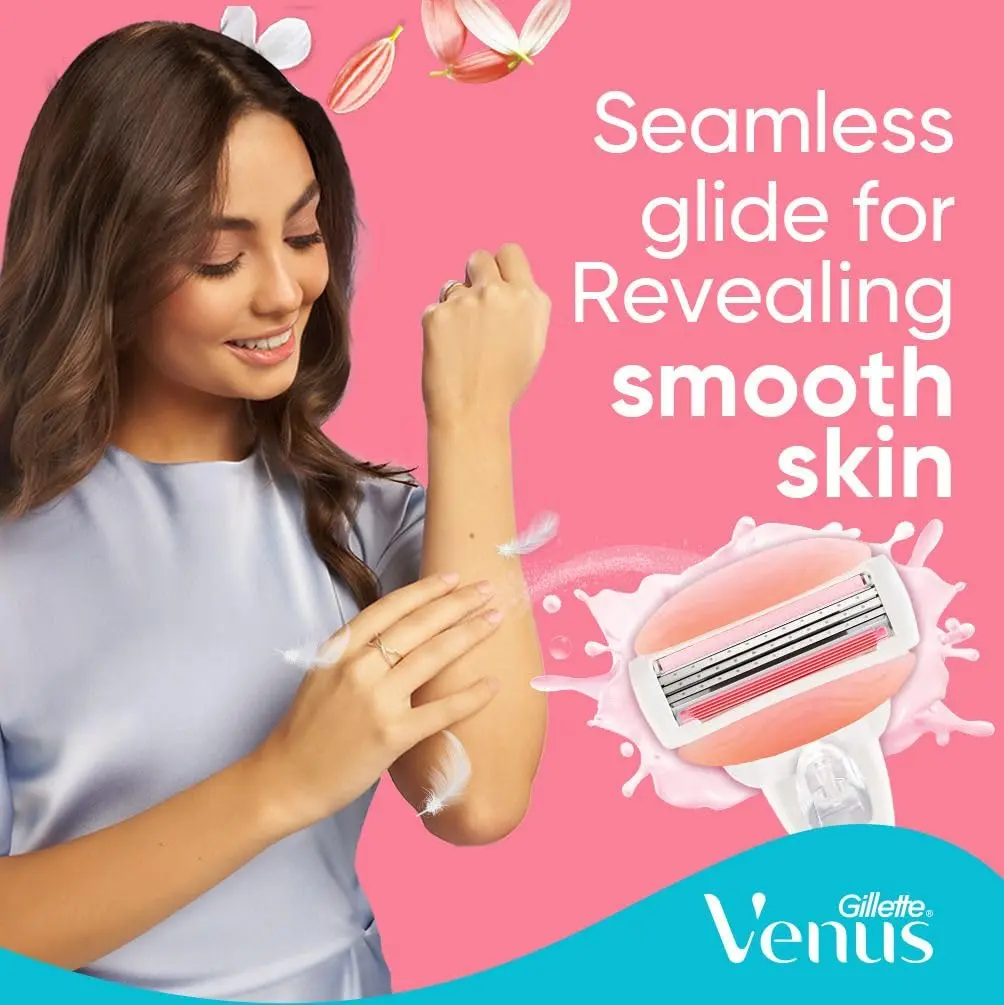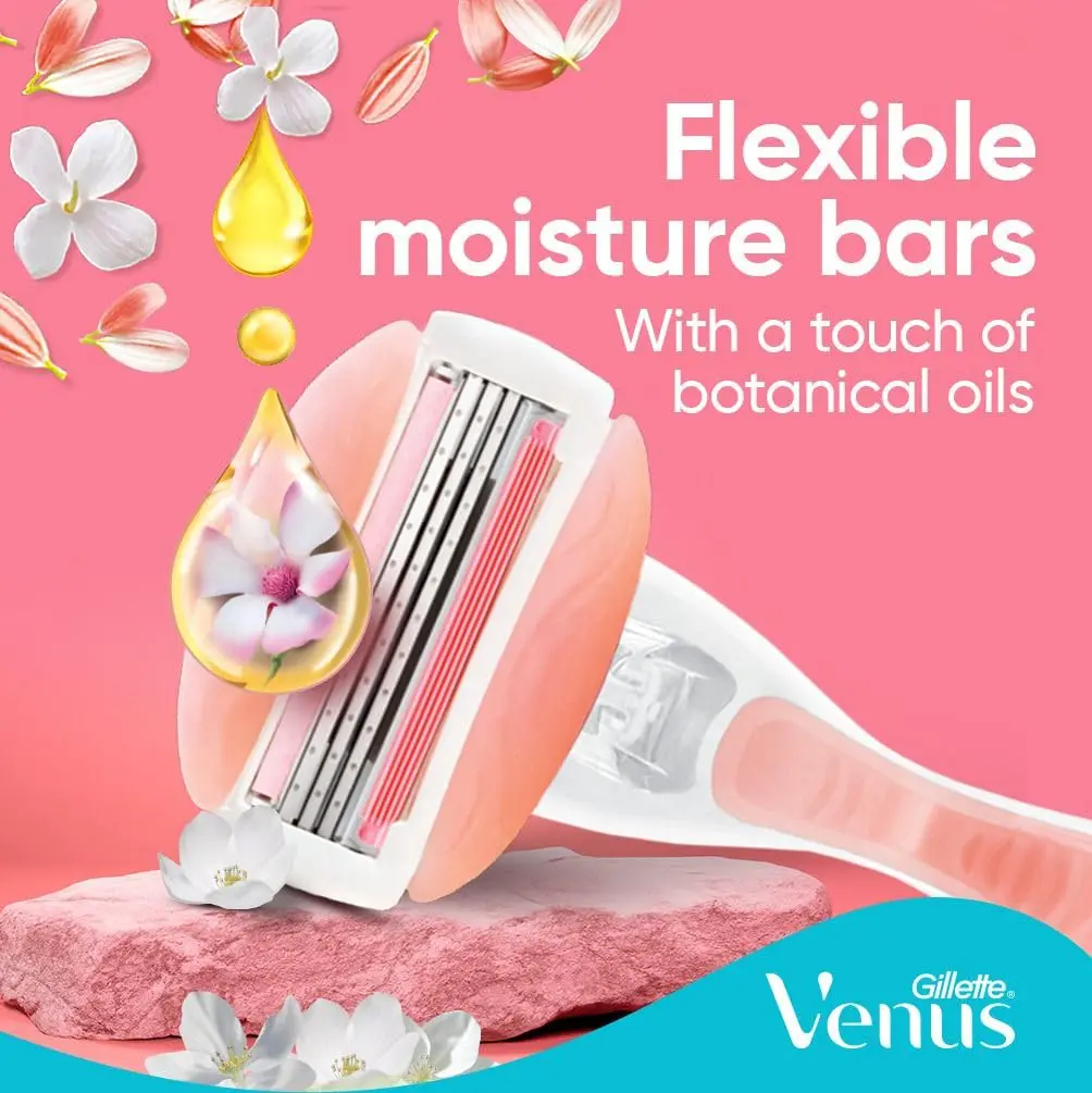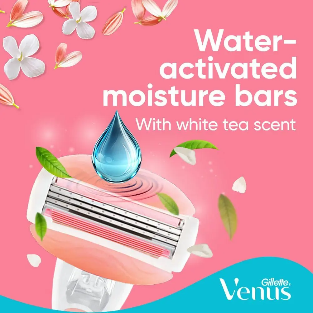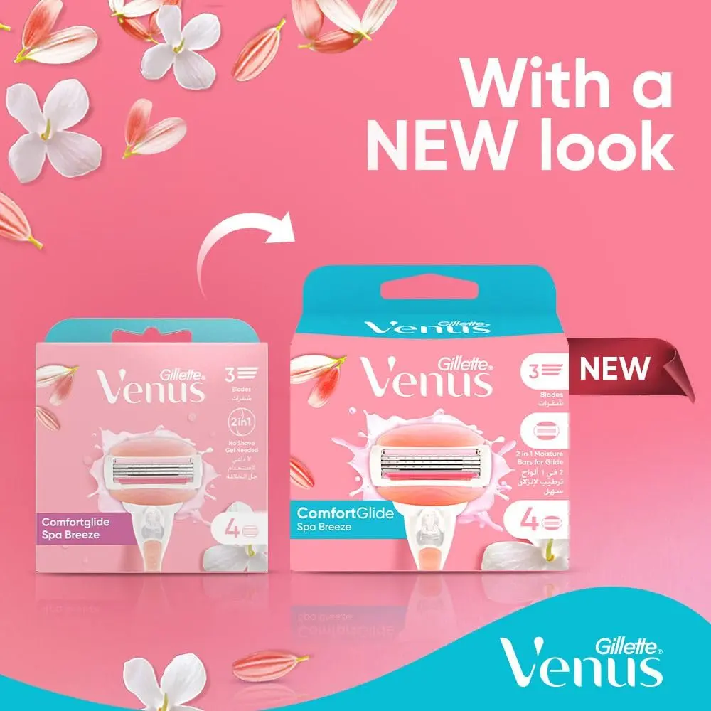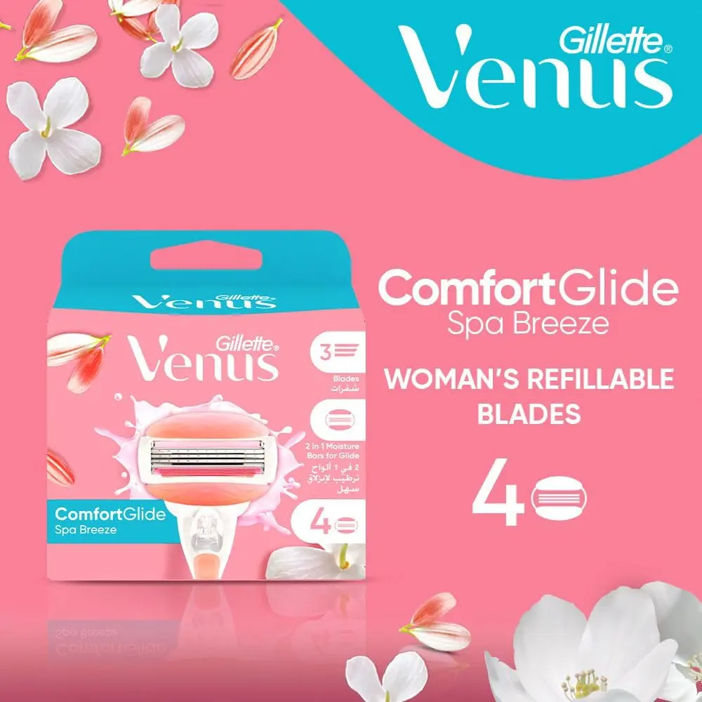 Experience a luxuriously smooth shave with Venus ComfortGlide SPA Breeze Razor Carts. These innovative razor cartridges are designed for ultimate comfort and effortless glide, leaving your skin feeling soft, smooth, and beautifully cared for. Infused with flexible moisture bars containing a touch of botanical oils, these cartridges release rich hydration during your shave, minimizing friction and maximizing comfort. Enjoy the invigorating sensation of water-activated moisture bars with a delicate white tea scent that transforms your shaving routine into a spa-like experience. The 3-blade design ensures a close and precise shave, effortlessly removing hair for impeccably smooth skin. Embrace sustainability by keeping your Venus handle and simply changing the blade. Each cartridge is engineered for optimal performance and long-lasting use, providing exceptional value and reducing waste. These refill cartridges are compatible with all Venus handles (excluding Simply Venus), making them a convenient and eco-friendly choice for your shaving needs. Say goodbye to dryness and irritation, and hello to beautifully smooth and hydrated skin with Venus ComfortGlide SPA Breeze Razor Carts. Upgrade your shaving ritual today and indulge in the ultimate comfort and performance. Perfect for sensitive skin, these cartridges are dermatologist-tested and designed to minimize irritation. Enjoy the confidence that comes with flawlessly smooth and healthy-looking skin. The pivoting head adapts to your curves and contours, ensuring that every area is reached with ease. Experience the difference of Venus ComfortGlide and elevate your shaving experience to new heights.