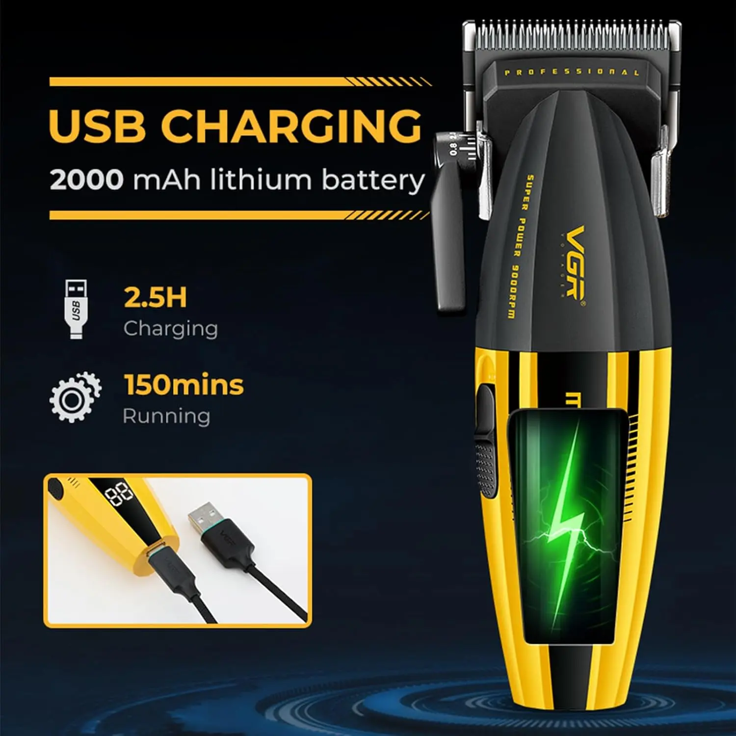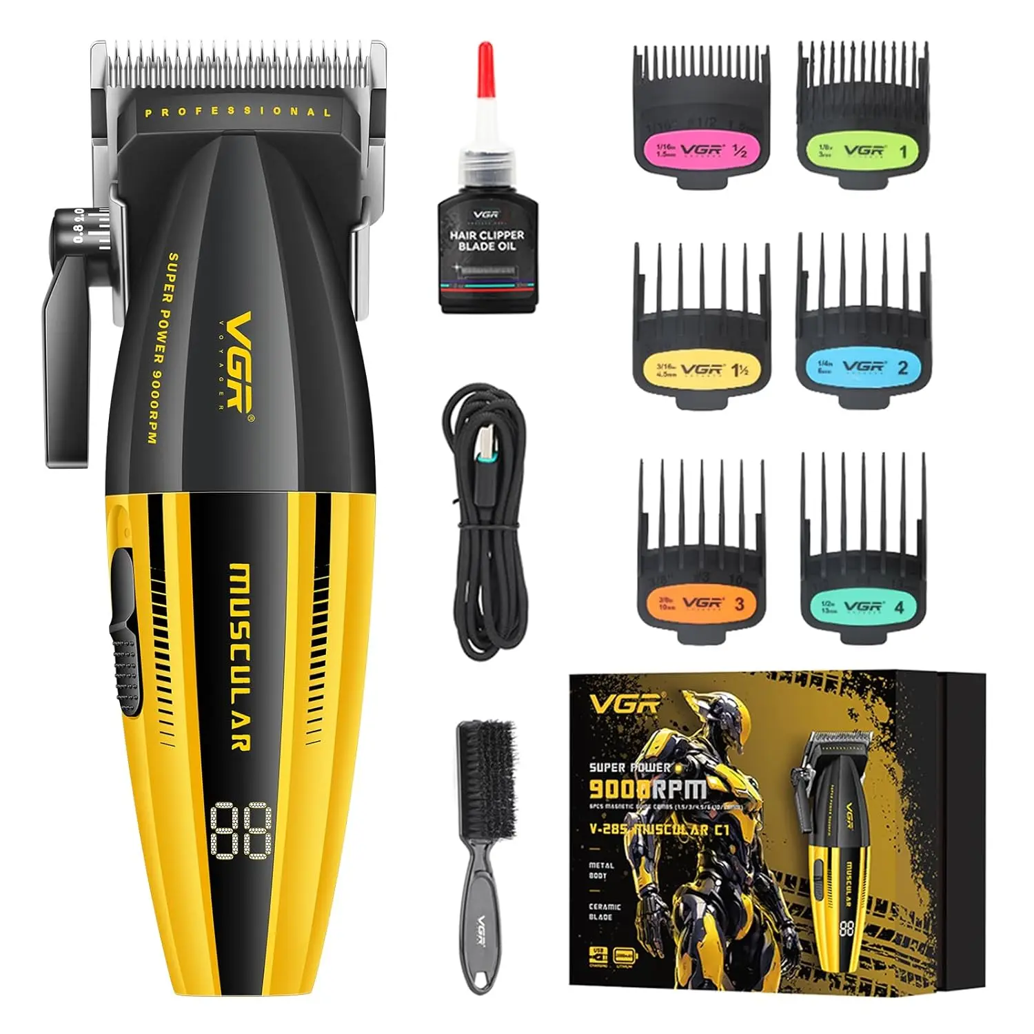 The VGR 285 hair clipper is your all-in-one solution for professional-quality haircuts at home or on the go. This complete hair cutting kit provides everything you need for a precise and comfortable grooming experience. Achieve various lengths and styles with the included six attachment combs (1.5mm, 3mm, 4.5mm, 6mm, 10mm, and 13mm). The adjustable cutting length, ranging from 0.8mm to 2mm, gives you the flexibility to create clean transitions, sharp lines, and smooth cuts. Also included is a styling comb for perfecting your look, oil to keep the blades in top condition, and a convenient USB charging cable. Powered by a long-lasting 2000mAh lithium battery, the VGR 285 offers up to 150 minutes of cordless operation after a 2.5-hour charge. The smart LED display clearly shows the remaining battery level, preventing unexpected power outages. Its compact, lightweight, and ergonomic design ensures maximum comfort and ease of use. The VGR 285 reduces hand fatigue, even during longer grooming sessions. The ergonomic handle provides optimal control for smooth and effortless handling. A powerful 9000RPM motor provides exceptional performance and precision. It effortlessly cuts through thick, frizzy hair and beards without snagging or pulling. The self-sharpening stainless steel blades ensure a clean and precise cut every time. The VGR 285 makes an excellent grooming gift for fathers, husbands, boyfriends, sons, and friends. This professional hair cutting kit delivers a premium grooming experience.