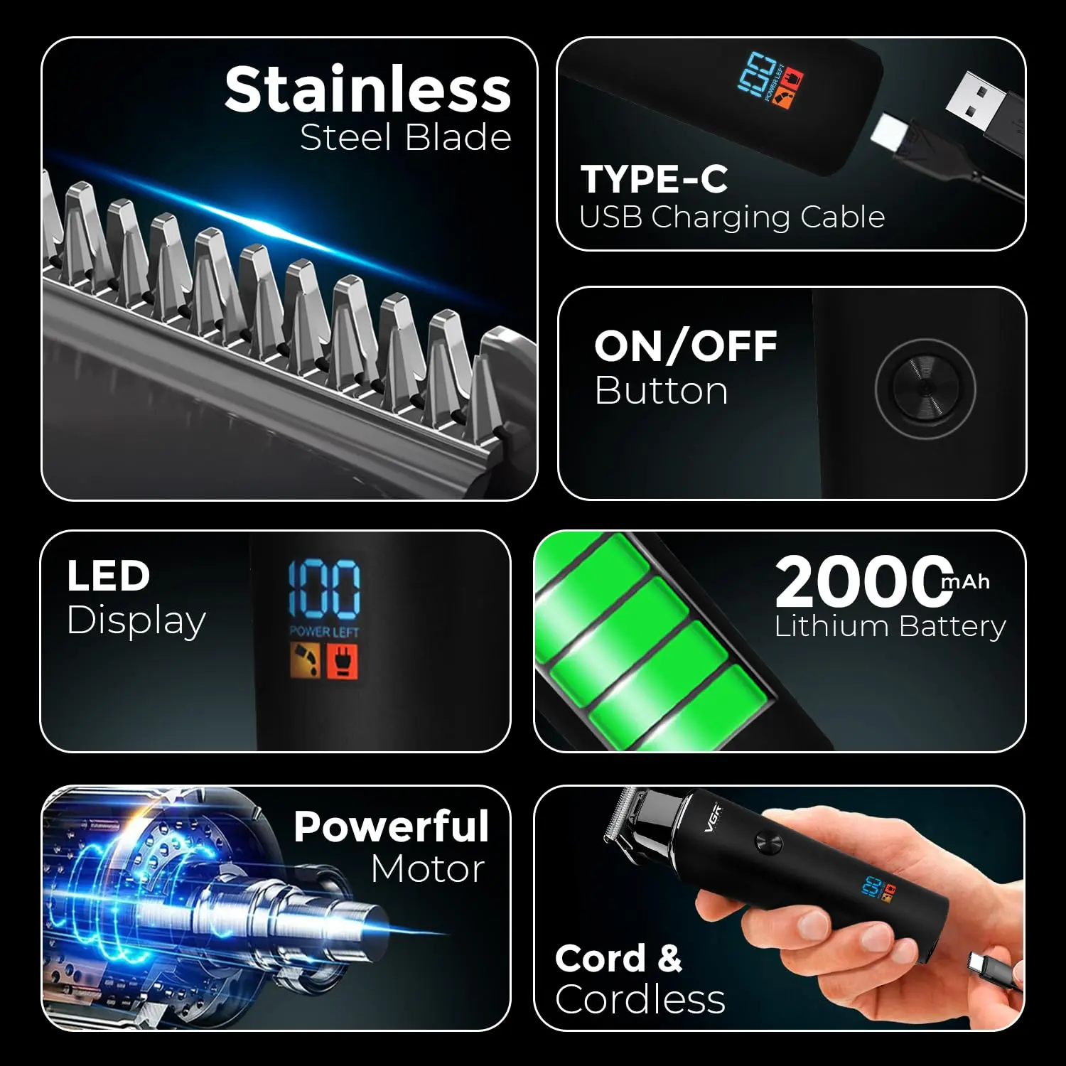 The VGR Hair Trimmer delivers professional close cuts with its precision blade and guide combs. USB-C charging, LED display, and easy operation make grooming effortless.
