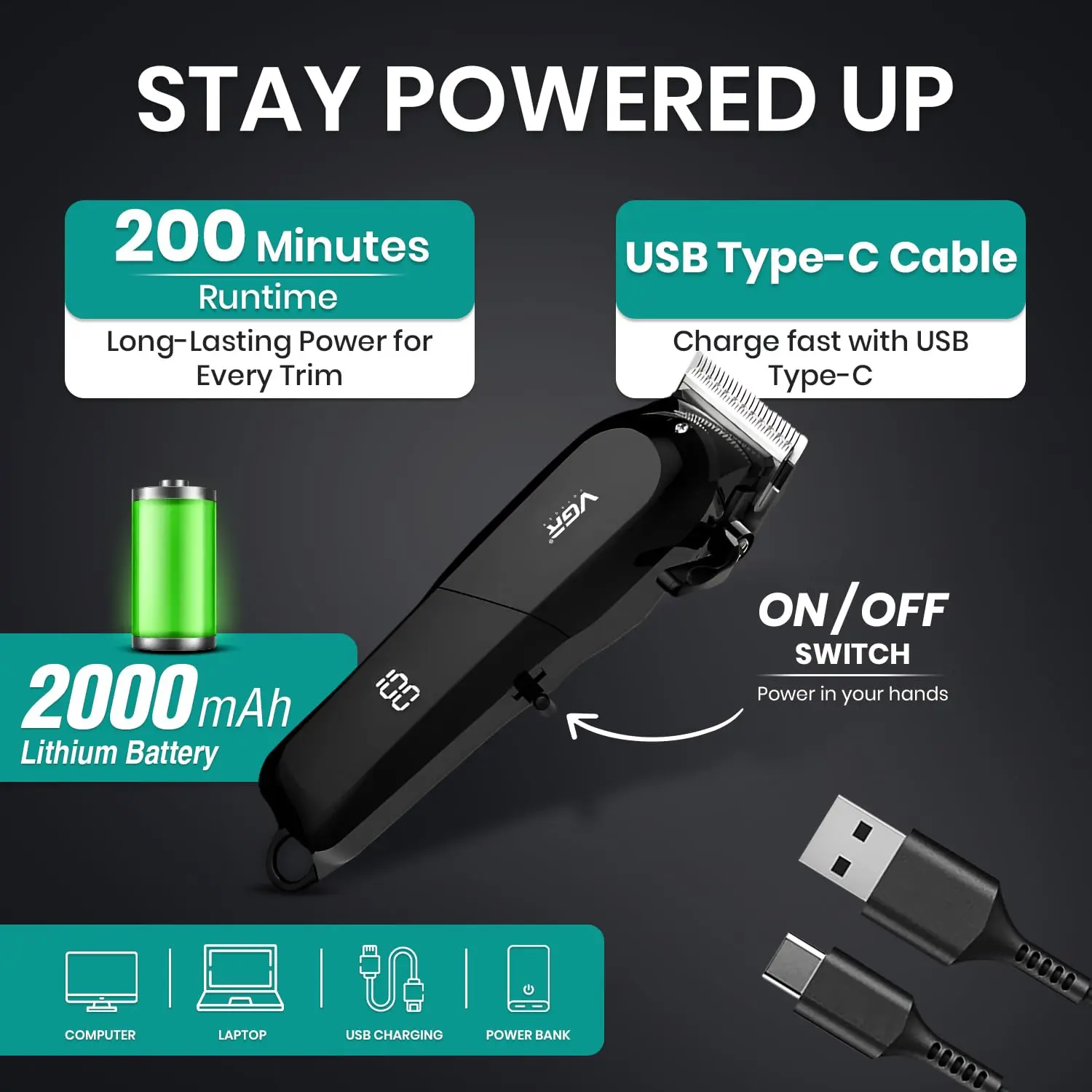 Experience exceptional cutting performance with the VGR V-118 Cordless Hair Clipper. This versatile tool is designed for both professional barbers and home users, delivering precise and clean cuts every time. Equipped with ultra-sharp stainless steel blades, the clipper effortlessly glides through all hair types, even thick and coarse hair. The powerful motor ensures consistent performance, while the adjustable cutting lengths (0.8mm-13mm) and 6 comb attachments provide exceptional versatility. Whether you’re aiming for a short buzz cut or a longer, textured style, the VGR V-118 has you covered. Enjoy the freedom of corded and cordless operation. The built-in rechargeable 2000mAh battery offers long-lasting power, allowing you to complete your grooming sessions without interruption. The ergonomic, lightweight design ensures a comfortable grip and easy handling, reducing hand fatigue during extended use. Its compact size makes it travel-friendly, allowing you to maintain your desired hairstyle wherever you go. The VGR V-118 is your perfect grooming companion for professional results and on-the-go convenience.