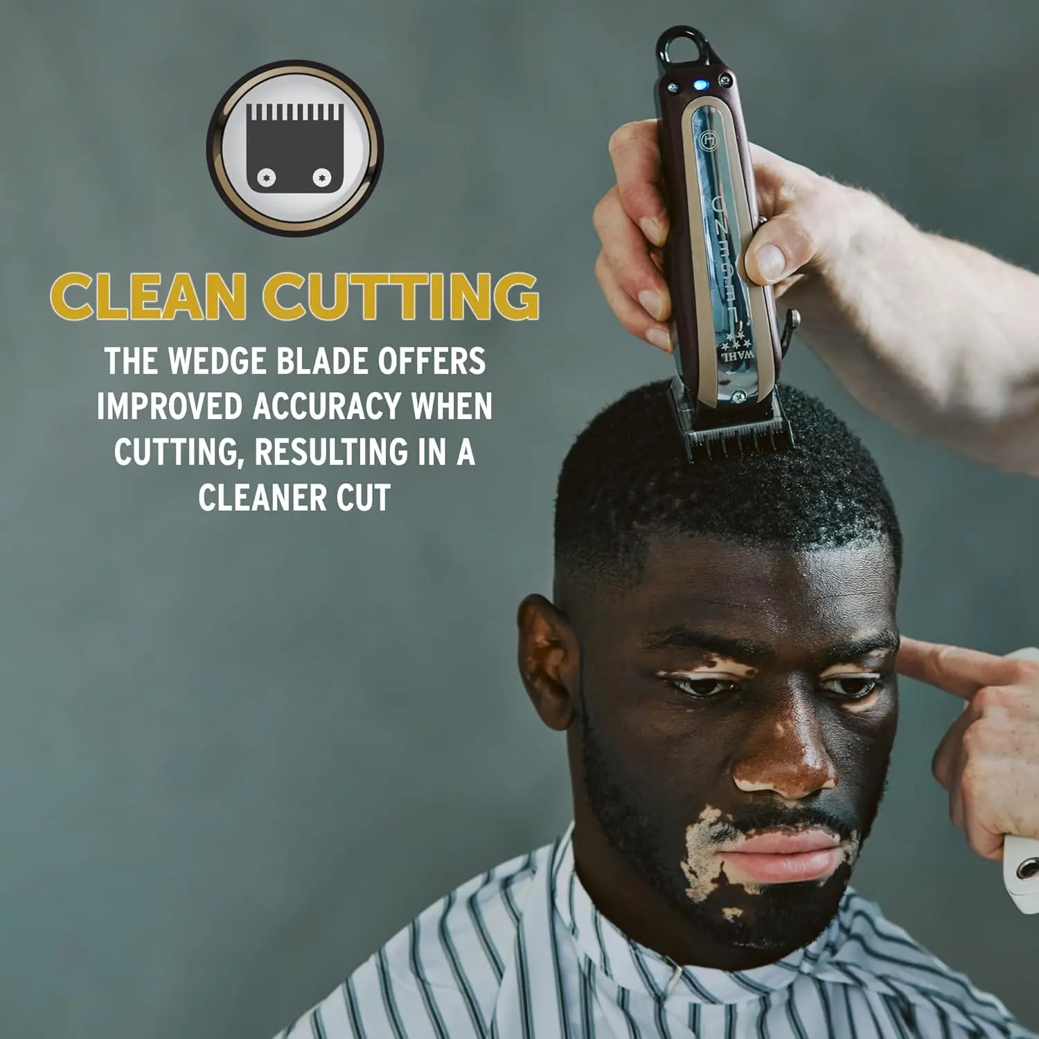 Experience the power and precision of the Wahl Cordless Legend Hair Clippers, a professional barber kit designed for ultimate performance and convenience. This cordless clipper combines legendary cutting ability with the freedom of cordless operation, powered by advanced lithium-ion technology. Enjoy an impressive 100 minutes of run time on a single 60-minute charge, allowing you to complete multiple haircuts without interruption. The Legend features an extended wide range fading wedge blade, providing superior fades and blending capabilities. Its taper lever offers a greater variation in cutting lengths, ranging from 0.7mm to 1.7mm, without the need for additional guide combs. Achieve precise and seamless cuts with the Crunch Blade technology, designed with unique cutting angles for blunter cuts and effortlessly blended clipping. The kit includes premium attachment combs, 70% stronger than standard combs, ensuring smooth gliding through hair. These secure-fit stainless steel attachments offer lengths from 1.5mm to 25mm, providing versatility for various hair lengths and styles. The Wedge Blade enhances cutting accuracy, allowing you to achieve clean and precise results every time. Upgrade your barbering experience with the Wahl Cordless Legend, the ultimate tool for professional-grade haircuts. This clipper delivers power, precision, and cordless convenience, making it an essential addition to any barber’s arsenal.