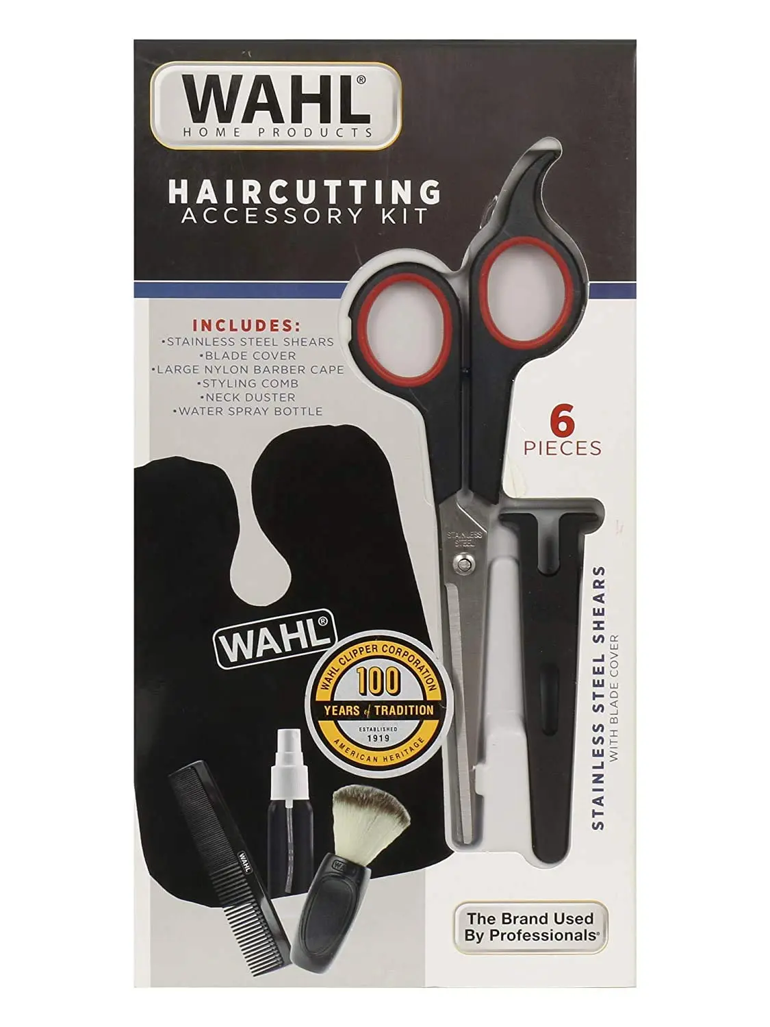 The Wahl Haircutting Accessory Kit includes a cape, shears, neck brush, spray bottle, and comb. Everything you need for salon-quality haircuts at home.