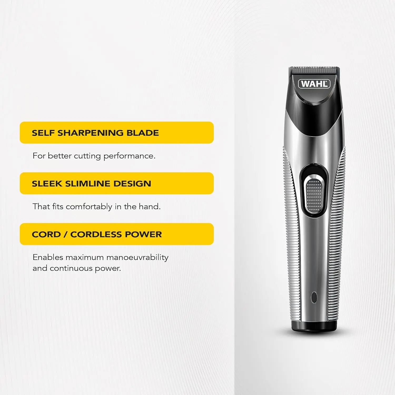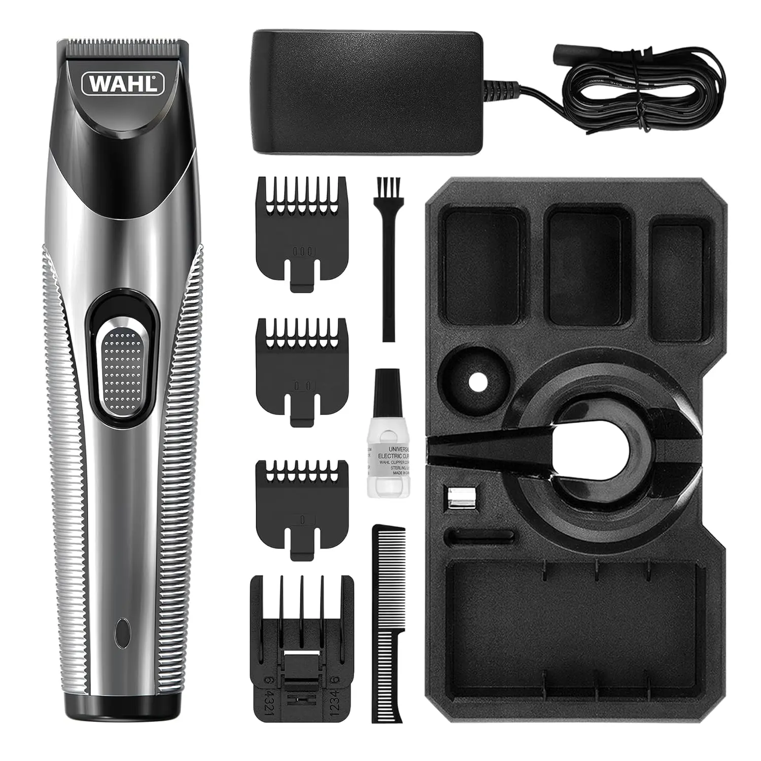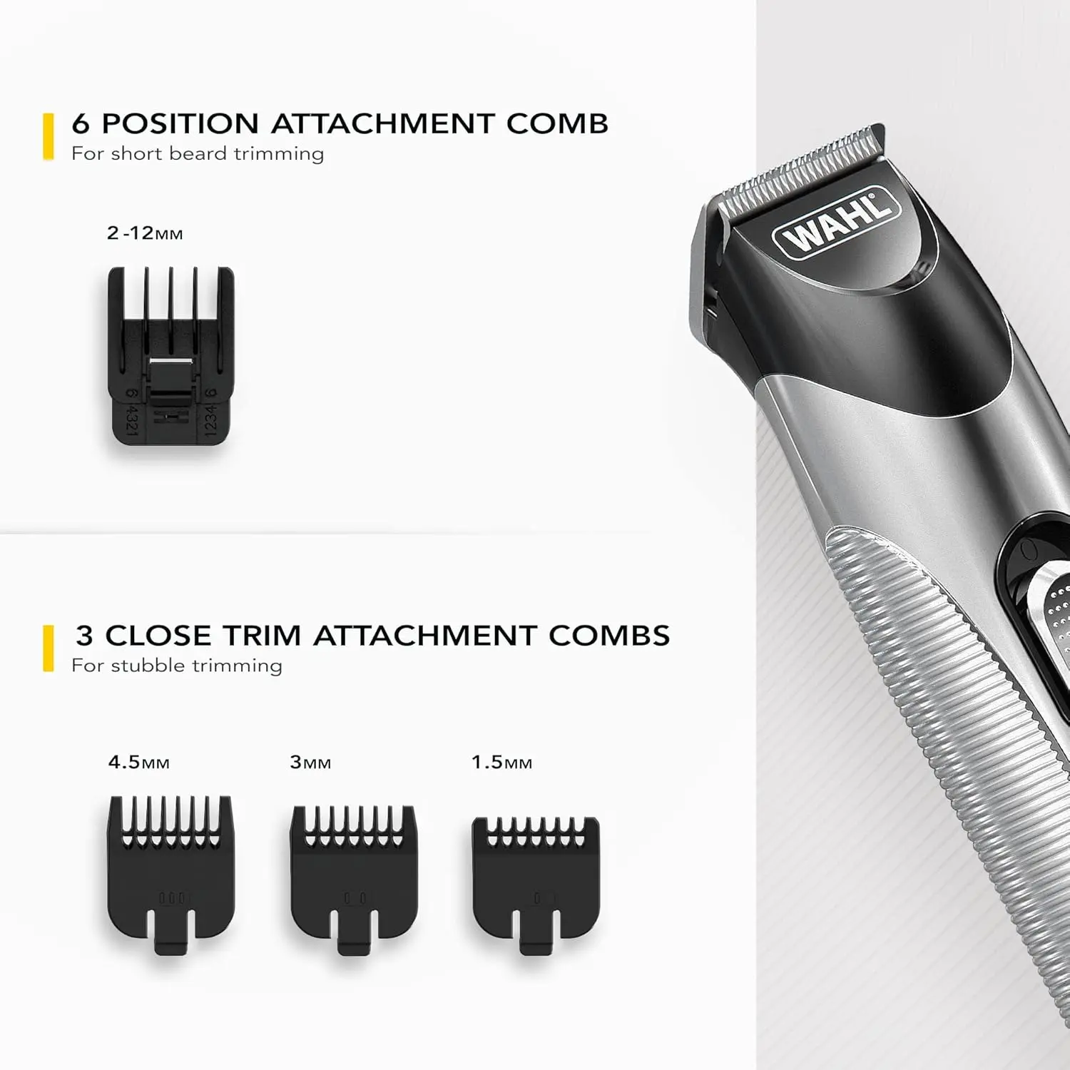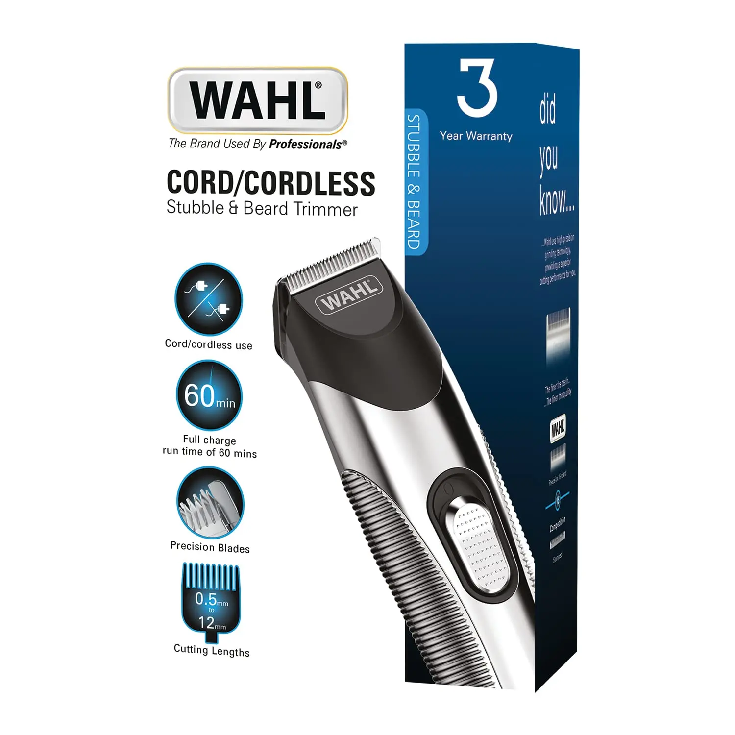 WAHL Silver Trim Trimmer delivers precision grooming with its high-quality stainless-steel blades. Achieve your perfect beard or stubble style with 13 adjustable cutting lengths ranging from 0.5 mm to 11 mm. Enjoy the flexibility of corded or cordless operation with up to 60 minutes of runtime. The slim and durable design ensures comfortable handling, while the LED charge indicator keeps you informed. Includes accessory stand, 3 stubble guide combs (1.5 mm, 3 mm, 4.5 mm), 10-position adjustable comb, cleaning brush, blade oil, and charger. Backed by a 1-year warranty and certified for GCC use. WAHL: the ultimate choice for barbers and grooming enthusiasts since 1919. Get professional results at home with this reliable and innovative trimmer.