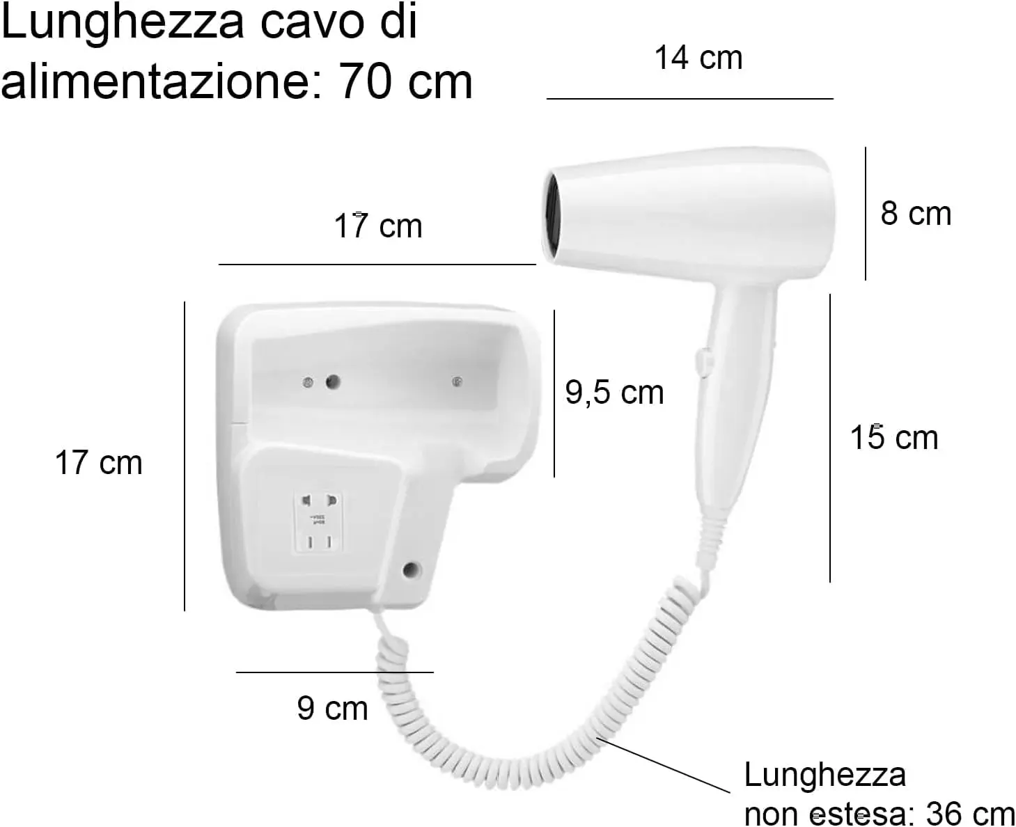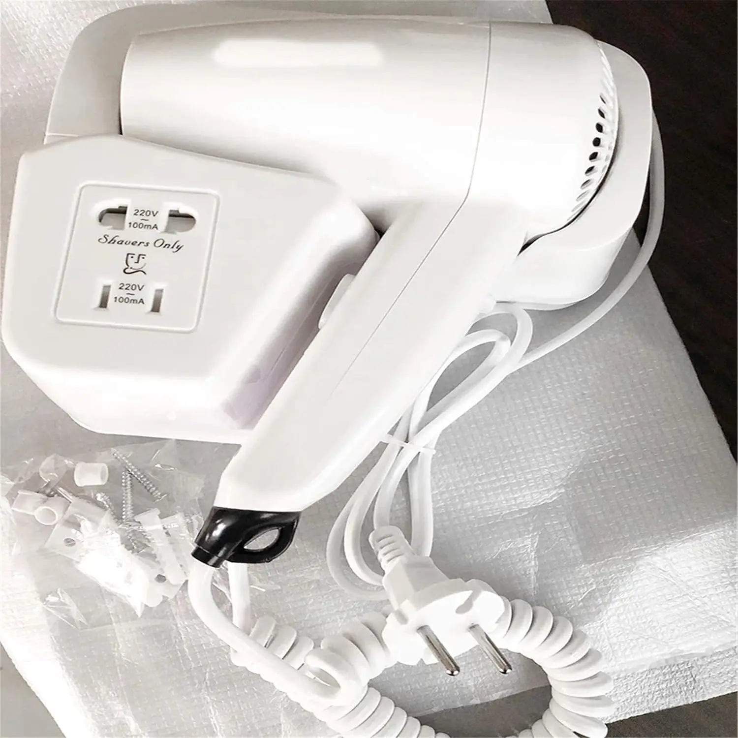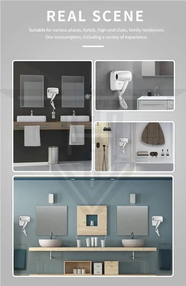 Experience powerful and efficient hair drying with our 1300W wall-mounted hair dryer. Engineered with a durable DC motor and uniform heat dissipation technology, this hair dryer delivers a strong and consistent airflow for quick and effective drying. Its lightweight design ensures comfortable use, preventing hand fatigue even during extended styling sessions. The space-saving wall-mounted design makes it ideal for hotels, home bathrooms, or anywhere you need to optimize counter space. The unique air inlet and outlet design creates a stronger, more concentrated airflow, significantly reducing drying time. Use the included concentrator attachment for focused airflow, perfect for creating smooth, sleek styles and eliminating frizz. This dryer features an elegant wall-mounted bracket with a built-in power outlet for added convenience. The automatic shut-off button on the bracket enhances safety, providing peace of mind for use in homes, hotel rooms, bathrooms, swimming pools, gyms, and sports centers. Upgrade your hair drying experience with power, convenience, and safety, all in one stylish package.