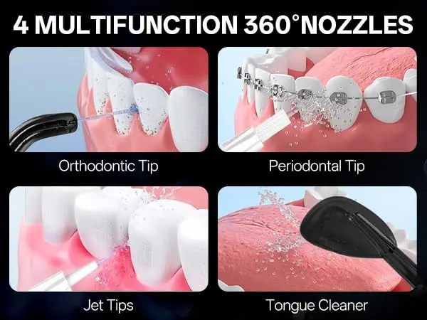 • 4 Nozzles: Standard, Tongue Cleaner, Periodontal Tip, and Orthodontic Tip.