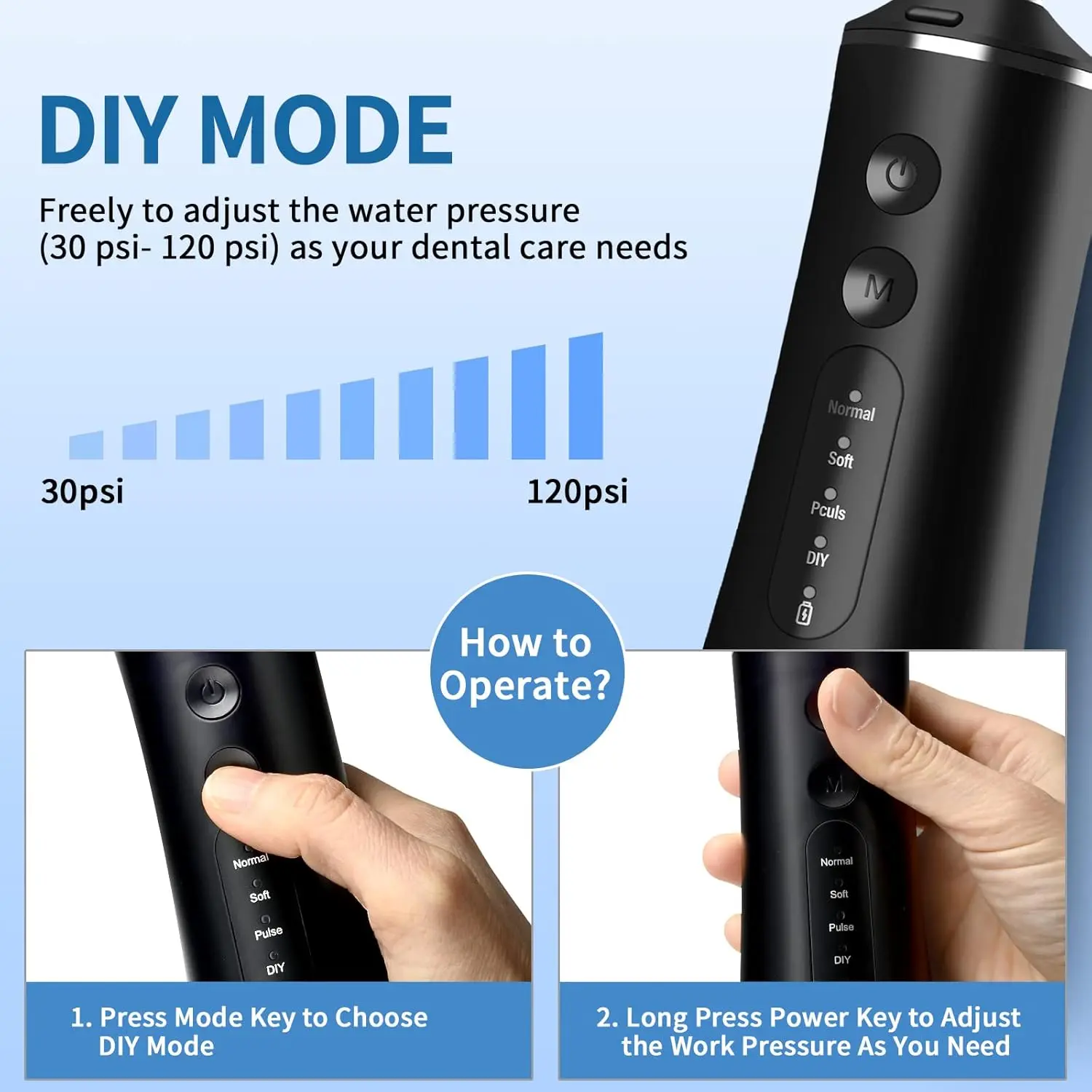 • 4 Cleaning Modes: Normal, Soft, Pulse, and Custom (50-120psi).