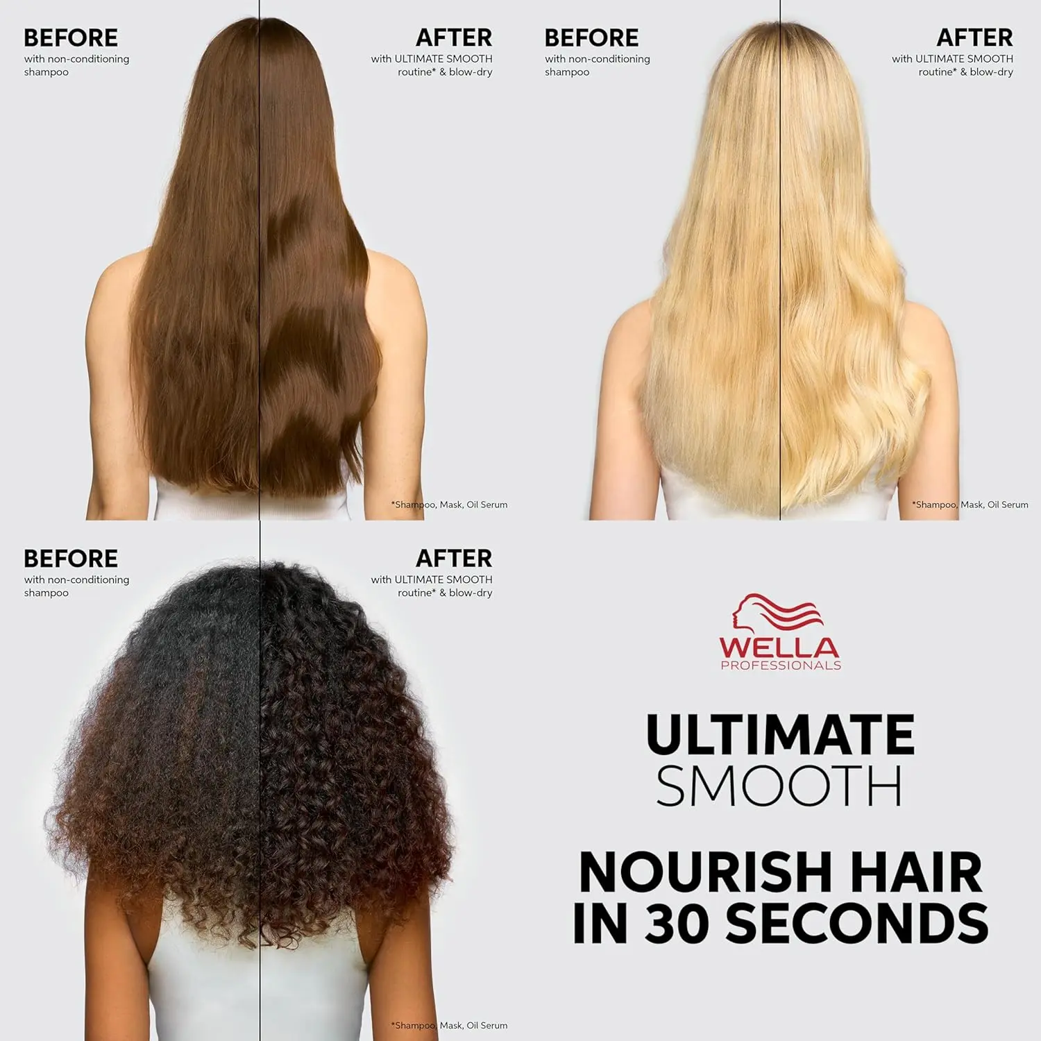 Transform dull, damaged, and frizzy hair with Wella Smooth Mask, your weekly dose of intense nourishment. This deeply conditioning treatment revitalizes your hair, leaving it smooth, manageable, and radiant. Infused with Squalane and Omega 9, this mask works both inside and out to replenish essential moisture and repair damage. The dermatologically tested formula is gentle yet effective, making it suitable for colored hair. Experience the luxury of a floral bouquet scent with notes of jasmine, vanilla, bergamot, peach, and sandalwood, transforming your hair care routine into a sensory delight. For optimal results, incorporate this hair mask into your regular hair care regimen with ULTIMATE SMOOTH shampoo and Miracle Oil Serum. Use Miracle Oil Serum as the final step to nourish hair in just 30 seconds and achieve smoothness that lasts up to 3 days (if unwashed for 3 days vs. untreated). This vegan haircare product is committed to no animal testing, aligning with ethical beauty standards. The Wella Company is a member of the International Collaboration on Cosmetics Safety. Say goodbye to frizz and hello to silky, healthy-looking hair with Wella Smooth Mask! Discover the secret to unlocking your hair’s natural beauty and shine. Indulge in the rich, creamy texture and let the nourishing ingredients work their magic, leaving your hair feeling softer, smoother, and more manageable than ever before. Perfect for all hair types struggling with dryness, damage, or frizz, this mask is a must-have addition to your weekly self-care ritual. Experience the difference with Wella Smooth Mask and unlock the secret to healthier, more beautiful hair. Enjoy the confidence that comes with knowing your hair looks and feels its best.