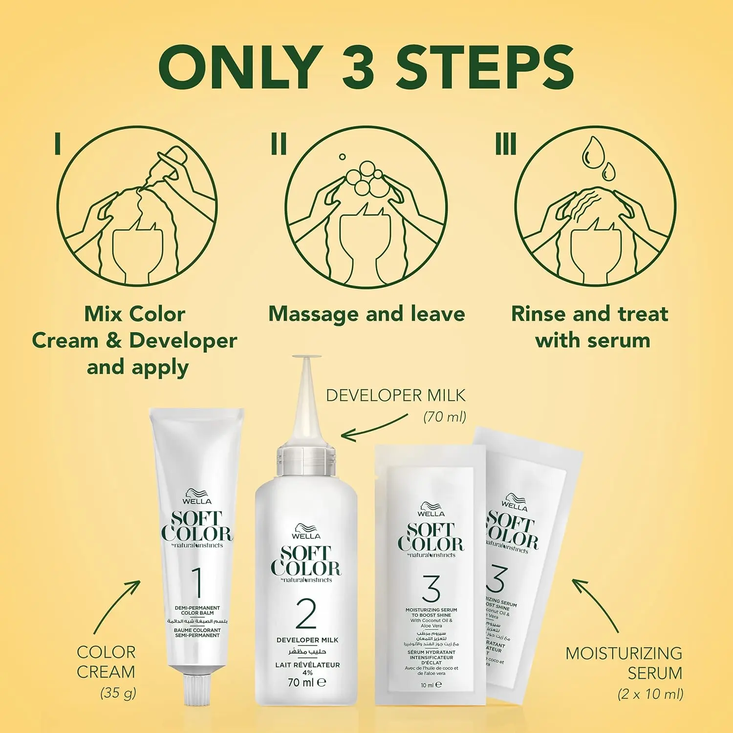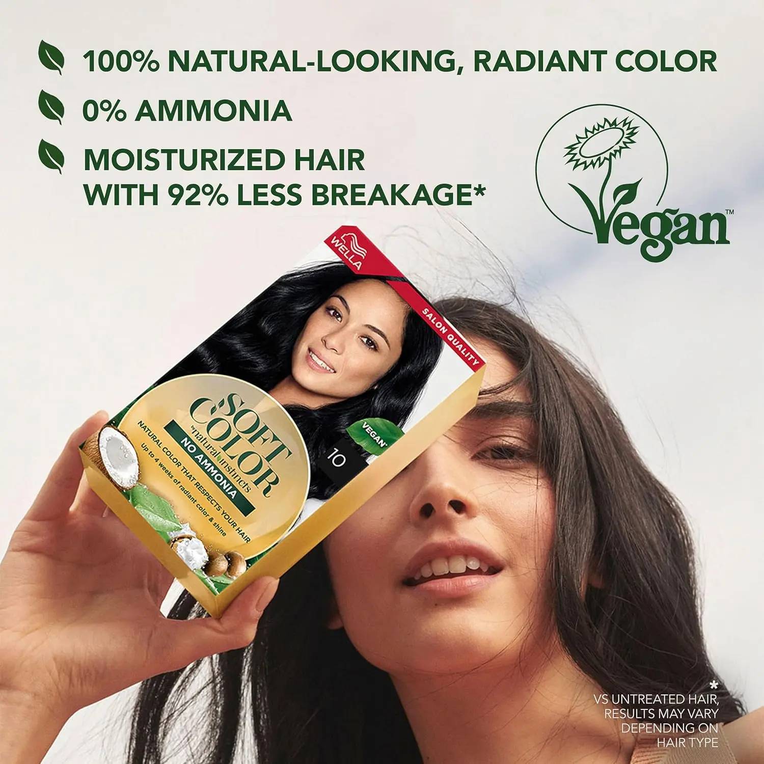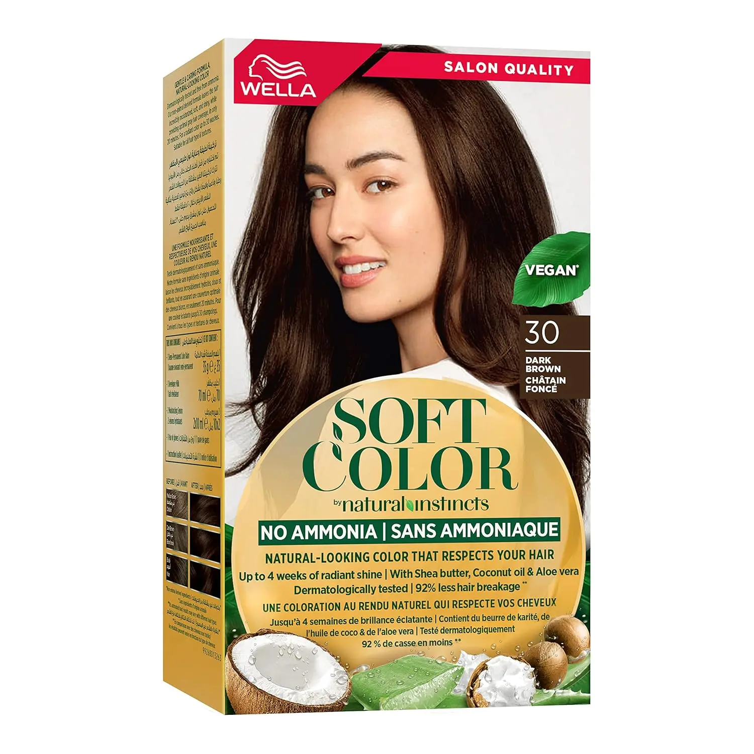 Discover Wella Soft Color 30 Dark Brown, the ammonia-free hair color solution that delivers multidimensional tones and radiant shine while prioritizing the health of your hair. This gentle formula, enriched with 99% Shea Butter, Coconut Oil, and Aloe Vera, nourishes and protects your hair during the coloring process. Experience up to 90% less hair breakage compared to traditional hair color, leaving your hair feeling soft, smooth, and revitalized. Wella Soft Color provides harmonious grey coverage, effectively blending away up to 70% of grey hairs for a natural and youthful look. Achieve a rich, dark brown color that complements your complexion and enhances your natural beauty. This easy-to-use formula offers a convenient and mess-free application, allowing you to achieve salon-quality results in the comfort of your own home. Say goodbye to harsh chemicals and hello to vibrant, healthy-looking hair with Wella Soft Color. Enjoy long-lasting color and shine that will turn heads. The moisturizing properties of Shea Butter, Coconut Oil, and Aloe Vera help to prevent dryness and breakage, keeping your hair strong and healthy. This ammonia-free formula is gentle on your scalp and hair, making it suitable for even sensitive skin types. Transform your look with confidence, knowing that you’re using a hair color that’s both effective and good for your hair. Get ready to experience the difference with Wella Soft Color – the perfect choice for beautiful, healthy, and vibrant hair. It will enhance your hair with a rich, beautiful dark brown shade. This product is designed to be both gentle and effective. Enjoy the process with this easy to apply product. See results that you’ll adore and admire.