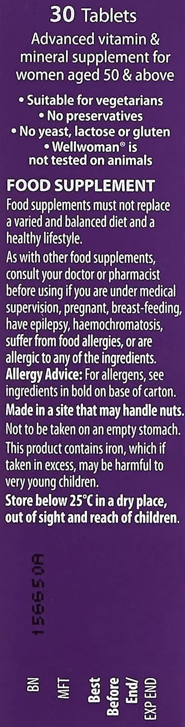 Wellwoman 50+ is a comprehensive daily multivitamin specifically designed to support the health and vitality of women aged 50 and over. This advanced formula provides a carefully balanced blend of vitamins, minerals, and plant-derived nutrients to address the unique needs of mature women. It goes beyond basic multivitamin support, offering targeted benefits for key areas of health, including brain function, eye health, and cardiovascular wellbeing. As women age, their nutritional requirements change, and Wellwoman 50+ is formulated to help bridge potential nutritional gaps. The formula contains essential vitamins like B vitamins, vitamin D, and vitamin C, as well as minerals such as iron, zinc, and selenium, all vital for maintaining optimal health and energy levels. In addition, Wellwoman 50+ includes specific nutrients known to support cognitive function and memory, which are essential for maintaining an active and engaged lifestyle. With antioxidants like vitamin E and vitamin C, the formula also helps protect against cellular damage from free radicals. It also includes nutrients to support cardiovascular health, contributing to a healthy heart. This supplement is free from salt and added sugar and is suitable for vegetarians. Wellwoman 50+ is not tested on animals, making it a ethical choice. Choose Wellwoman 50+ for a daily boost of vital nutrients to maintain overall health and vitality as you embrace this vibrant stage of life. It’s your comprehensive support system for a healthy, active, and fulfilling future.