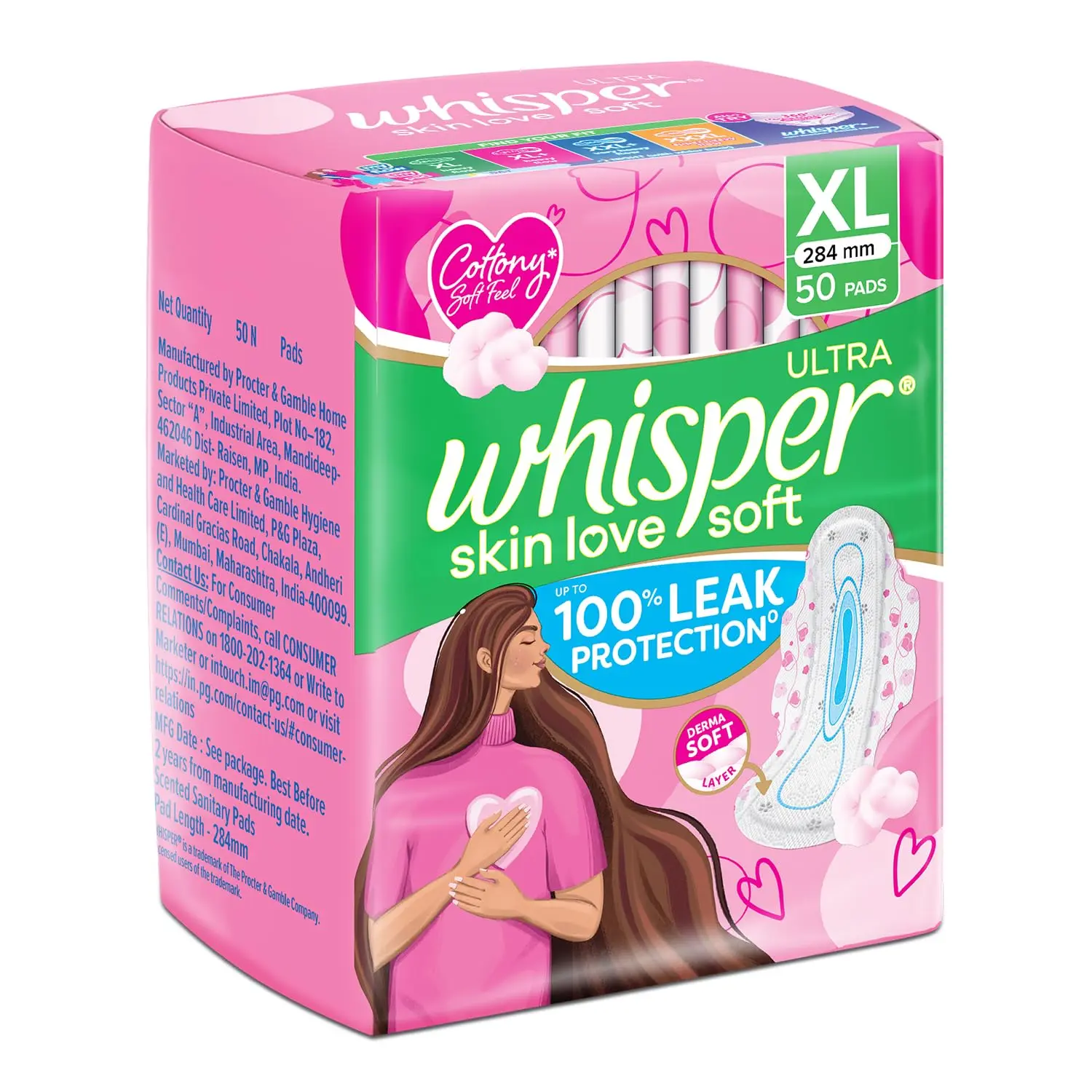 Experience ultimate comfort and protection with Whisper Ultra Soft XL Pads. Designed with your delicate skin in mind, these pads feature a soft top sheet that provides extra gentleness, minimizing irritation and ensuring a comfortable feel throughout the day or night. The innovative design incorporates stretchable wings that securely keep the pad in place, preventing shifting and ensuring worry-free movement. Feel confident and secure, knowing your pad will stay where it should, providing reliable protection against leaks. The advanced soft pores technology quickly draws liquid away from the surface and locks it deep within the core of the pad, keeping you feeling dry and fresh for longer. Enjoy superior absorption that keeps you comfortable and confident, even during your heaviest flow. These XL pads are nearly 20% longer than regular pads, providing extra coverage and enhanced protection against leaks. Experience the peace of mind that comes with knowing you have the added coverage you need, especially during the night or on days when you require extra security. Whisper Ultra Soft XL Pads combine comfort, protection, and reliability to give you the best possible experience during your period. Stay confident, comfortable, and worry-free with these exceptional pads. Each pack contains 50 pads, ensuring you have an ample supply to last through your cycle. Choose Whisper Ultra Soft XL Pads for a comfortable and confident period experience. The gentle materials, secure fit, and enhanced absorbency make these pads a must-have for every woman seeking superior protection and comfort.