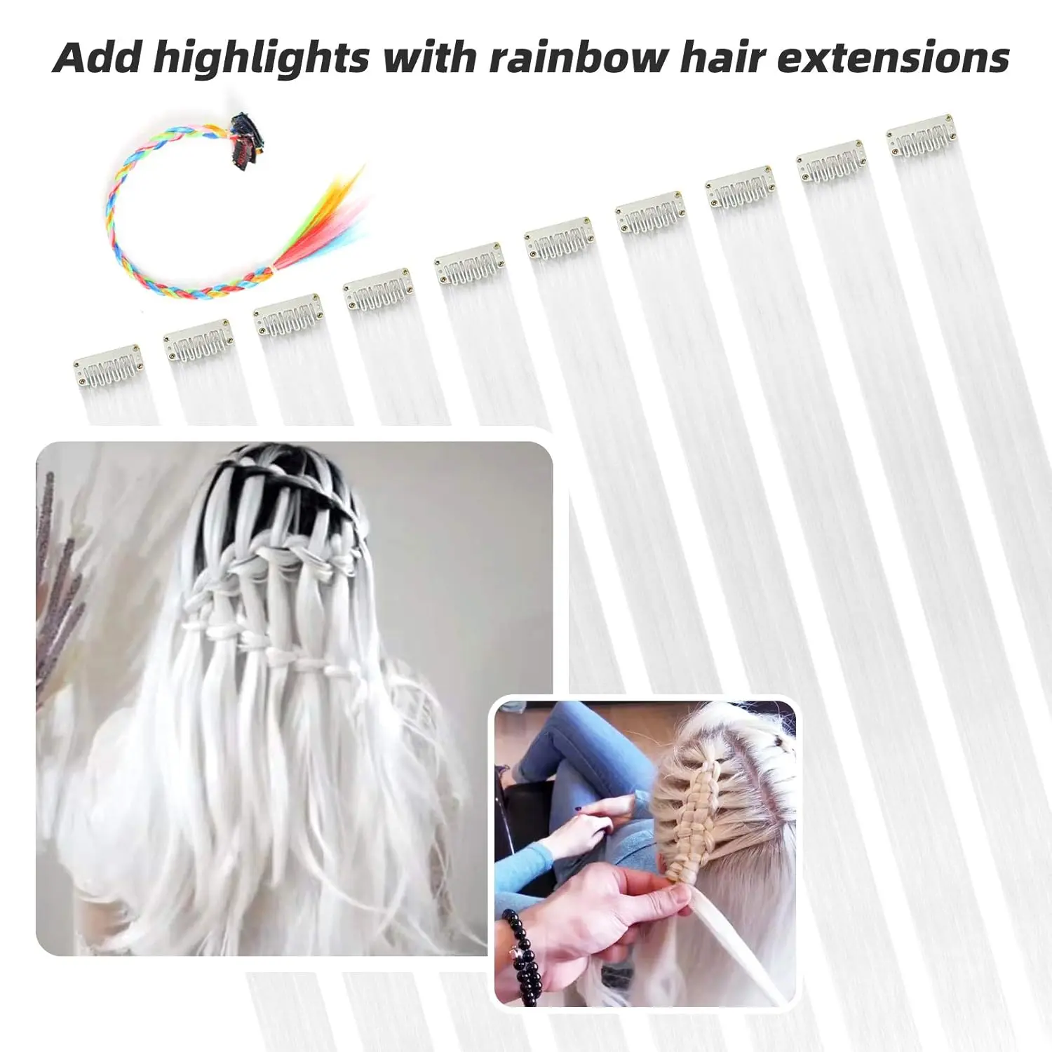 Add a pop of color and instant glamour to your hair with these White Hair Extensions with Clip-in Colored Highlights! Perfect for parties, costumes, or just adding a little fun to your everyday look, these extensions are lightweight and easy to use. Each piece weighs only 7 grams and comes individually packed to prevent tangling during delivery. No need for harsh chemical processes to achieve vibrant highlights – these high-quality Korea synthetic fiber extensions blend seamlessly with your natural hair and are incredibly easy to braid in. They look incredibly real and vibrant, adding dimension and personality to any hairstyle. Whether you’re dressing up for Christmas, Halloween, a cosplay event, a costume party, or just a casual outing, these clip-in extensions are the perfect way to elevate your look. These extensions allows you to change colors according to your mood.