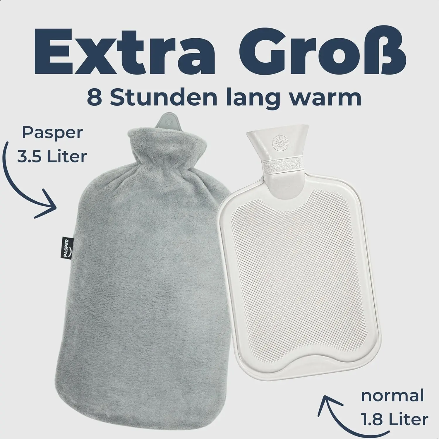 Experience unparalleled warmth and comfort with the Pasper XXL Hot Water Bottle! This extra-large 3.5-liter hot water bottle is designed to keep you cozy for up to 8 hours, twice as long as standard 1.8-liter bottles. Imagine filling it in the evening and still enjoying soothing warmth the next morning. Say goodbye to constantly refilling your hot water bottle and hello to long-lasting comfort.