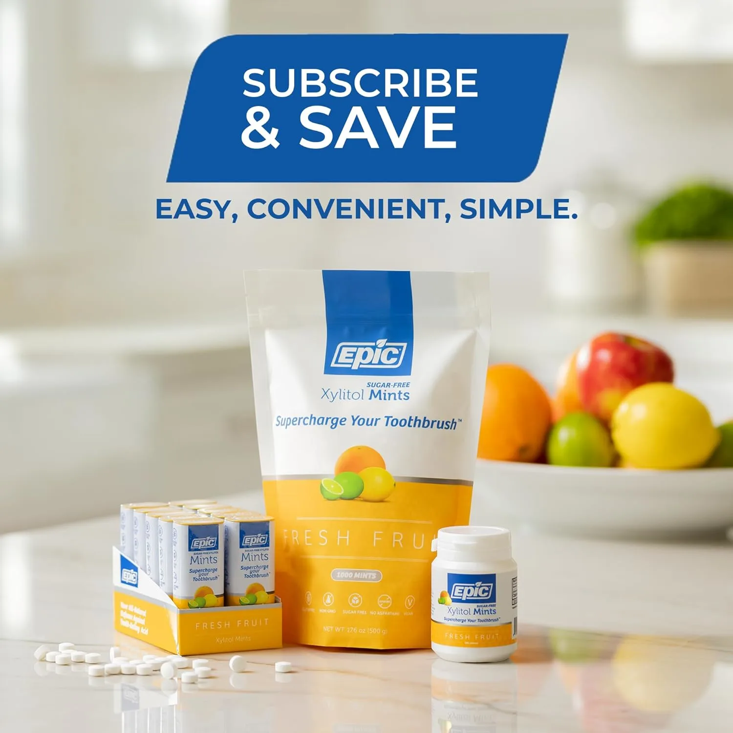 Indulge in the refreshing and guilt-free taste of Xylitol Mints Fresh Fruit! These delicious sugar-free mints are packed with the natural sweetness of xylitol, making them a healthy and satisfying alternative to traditional sugar candy. Each mint bursts with a vibrant fresh fruit flavor that will tantalize your taste buds and leave you feeling refreshed. With 180 mints in each container, you’ll have plenty to share or enjoy on your own. EPIC DENTAL’s Xylitol Mints are not only a treat for your senses but also beneficial for your oral health. Xylitol is known to help reduce plaque buildup and fight cavities, making these mints a perfect choice for maintaining a healthy smile. They are the ideal on-the-go breath freshener and a convenient way to enjoy a sweet treat without the guilt. Whether you’re looking for a healthy alternative to sugary snacks or a refreshing way to freshen your breath, Xylitol Mints Fresh Fruit are the perfect choice. Keep a container at your desk, in your car, or in your purse for a quick and guilt-free treat anytime, anywhere. Embrace the delightful taste of fresh fruit and the benefits of xylitol with every mint. Experience the difference of a sugar-free candy that is both delicious and good for you. These mints are crafted with care, using only the highest quality ingredients to ensure a premium taste and texture. Each mint is individually wrapped to maintain its freshness and flavor, ensuring that every bite is as enjoyable as the first. Share the goodness of Xylitol Mints Fresh Fruit with your friends and family and let them experience the joy of a healthy and delicious treat. Say goodbye to sugary snacks and hello to a guilt-free indulgence that you can enjoy every day. Order your container of Xylitol Mints Fresh Fruit today and discover a new way to satisfy your sweet cravings while taking care of your oral health. They are a great choice for anyone looking to reduce their sugar intake without sacrificing taste.
