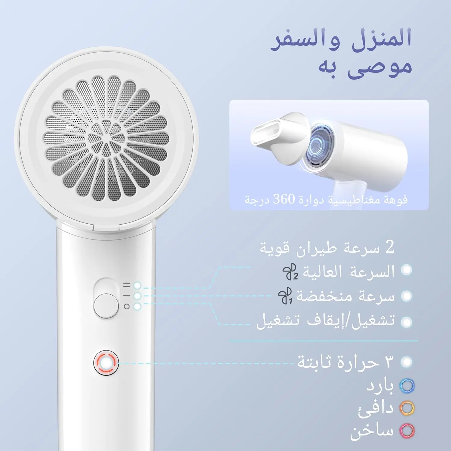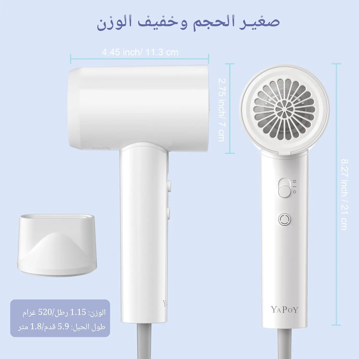 Weighing only 1.15 lbs (520g), the YAPOY is lightweight and travel-ready. The detachable magnetic filter makes cleaning a breeze and prevents hair from being drawn into the dryer. The 360° flexible nozzle and 1.8m (5.9 ft) cord provide maximum versatility and comfort during use. Get ready to experience faster drying times, healthier hair, and a quiet, convenient hair styling experience!