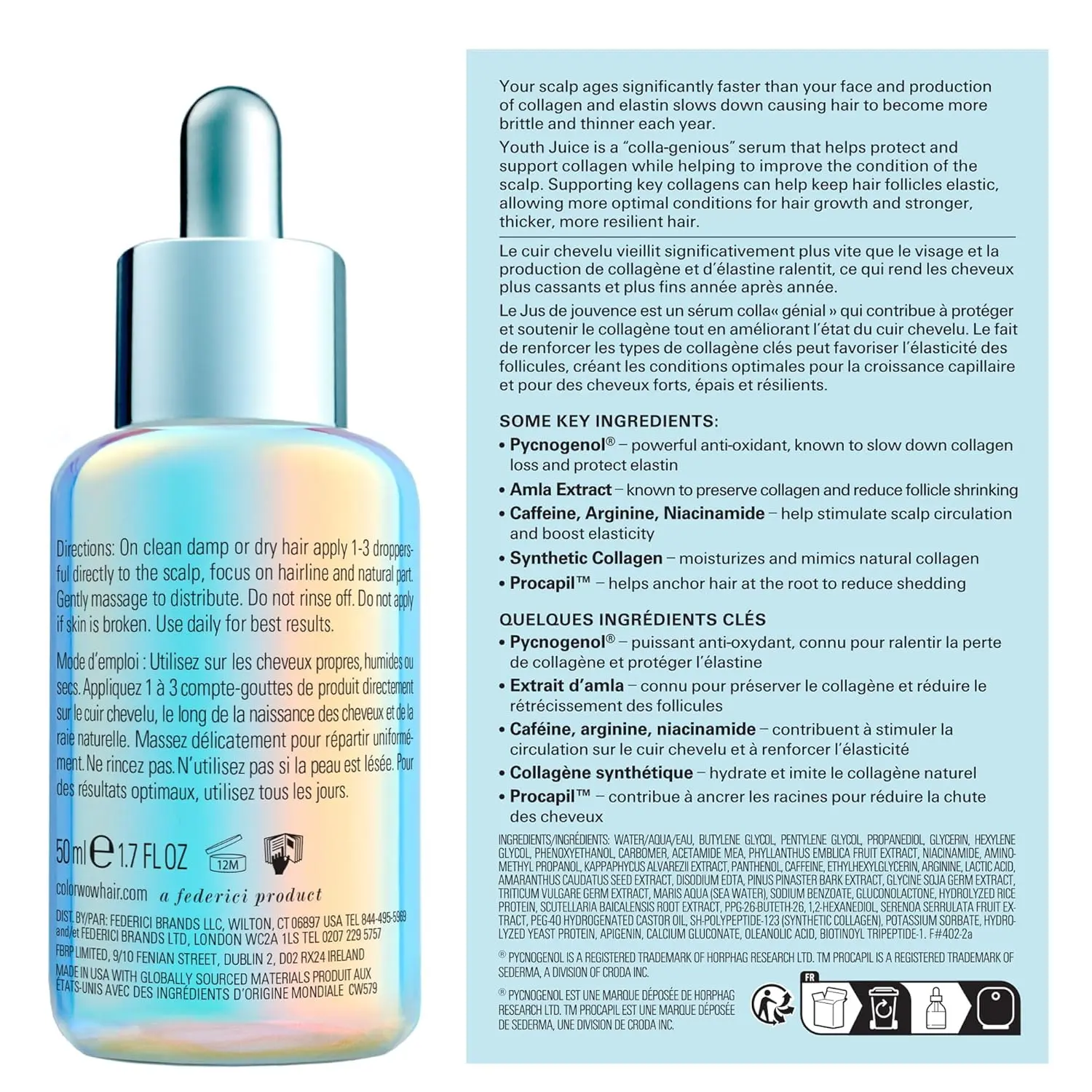 • Formulated with Procapil, Synthetic Collagen, Pycnogenol, Amla Extract, Caffeine, and Arginine